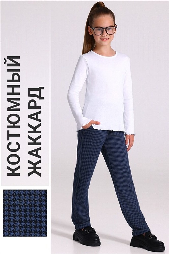 Зауженные брюки для девочки из плотного полотна с рельефным рисунком, выполненным с применением жаккардового плетения. Изделие на эластичном поясе, с удобными кармашками и отворотами по низу. Отличный вариант для школы! Уход: только машинная стирка (руками не стирать!) при температуре 40 градусов, без предварительного замачивания.