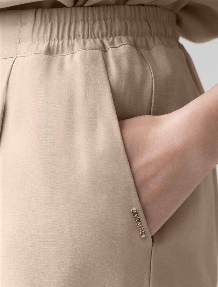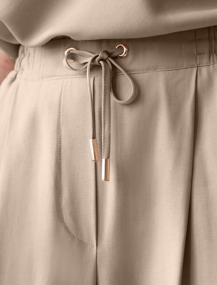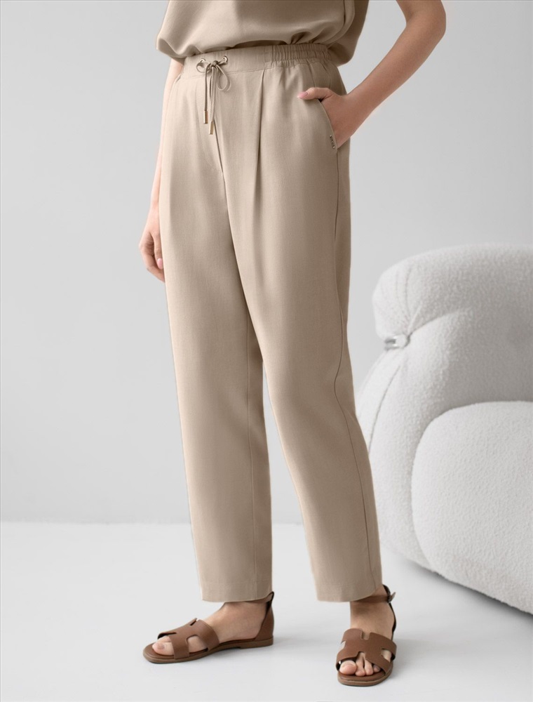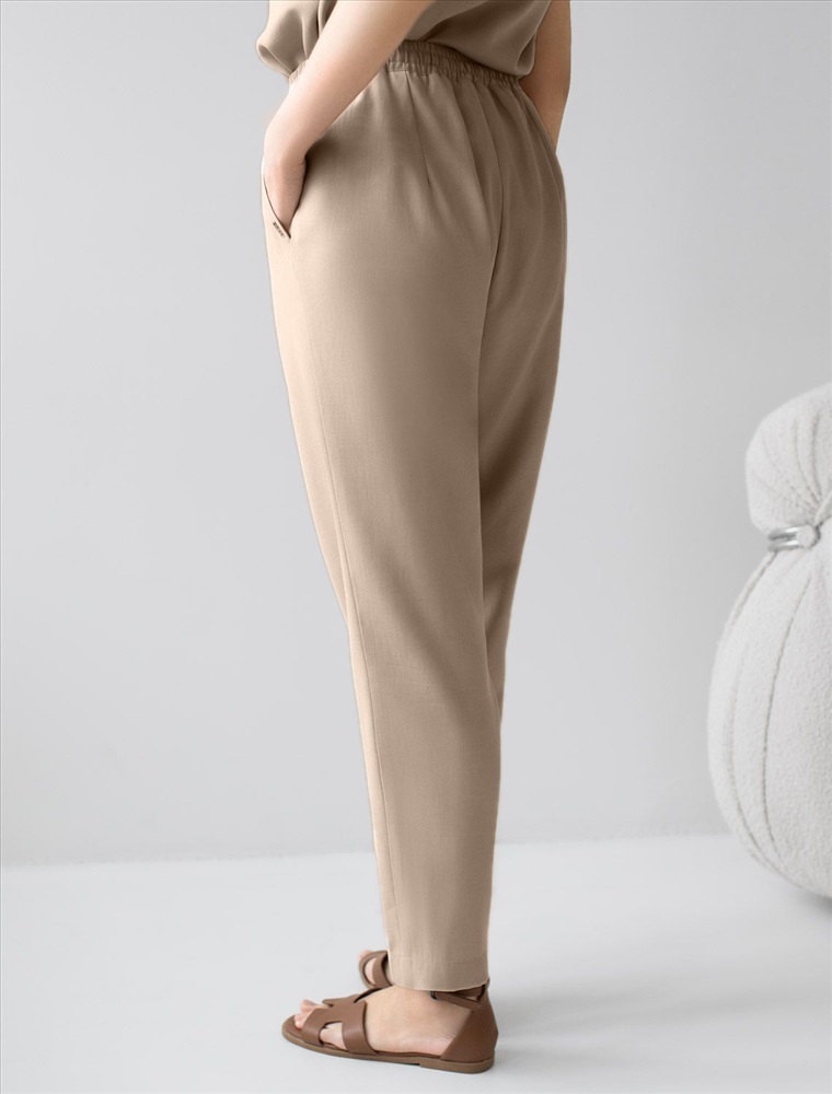 Брюки бананы светло-бежевого цвета выполнены из плотного лиоцелла. Лиоцелл это более дорогой и экологичный вариант вискозы, очень прочный и шелковистый. Модель отличается свободным кроем в бедрах и заужены к щиколотке. Удобный пояс на мягкой на резинке обеспечивает идеальную посадку по фигуре и гарантирует комфорт. Свободные брюки с высокой посадкой и аккуртными защипами создают идеальный силуэт и будут базовым элементом гардероба. Летние брюки отлично сочетаются с монохромным верхом, с ними можно создавать эффектные наряды как на выход, так и для ежедневных рабочих дел или простых прогулок.
