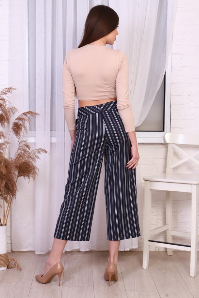 Укороченные брюки с боковыми карманами. Широкий пояс застегивается на пуговицу.