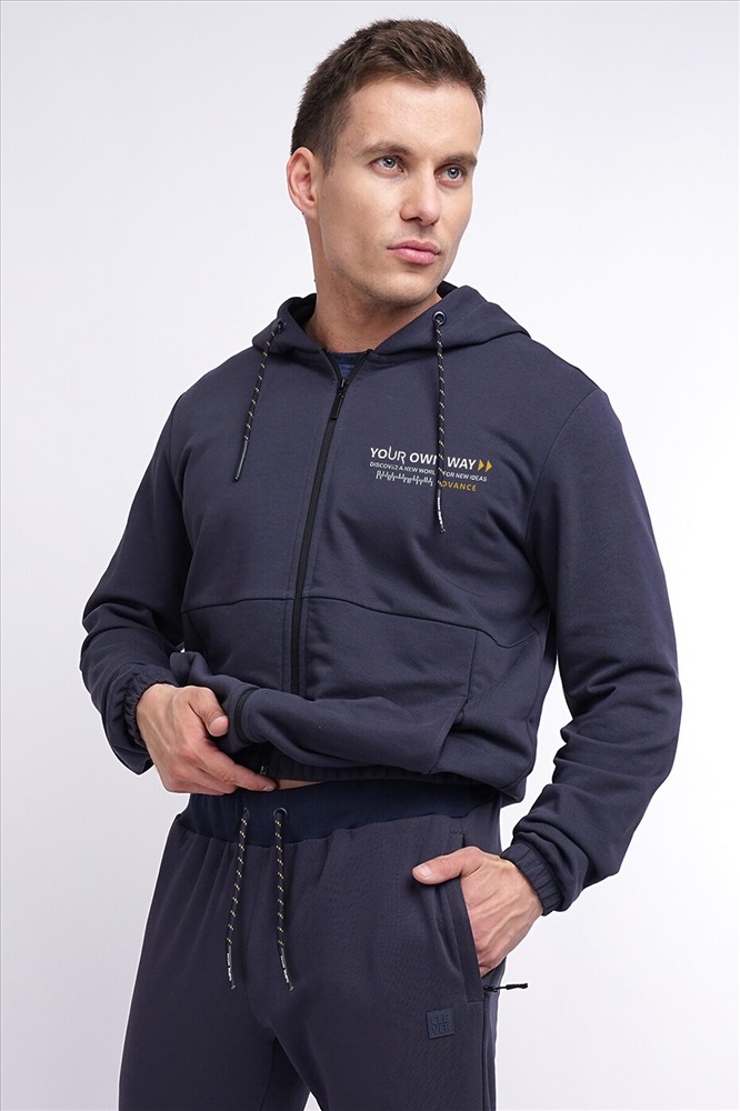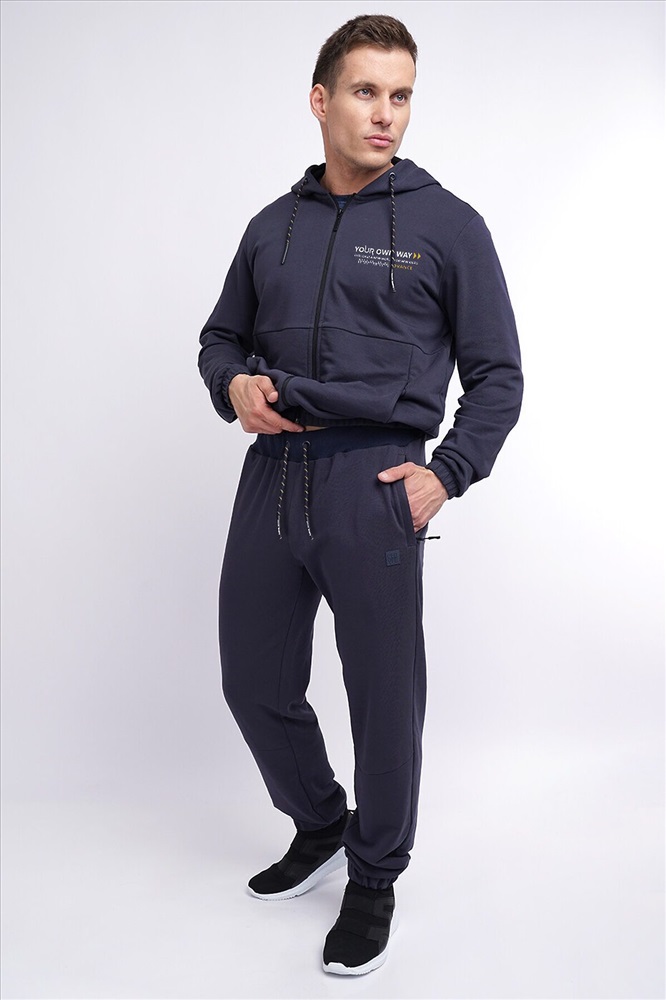 Мужские брюки из футера на эластичном поясе с пестрым шнуром и манжетах. Для функциональности предусмотрены боковые карманы на молнии. Спереди косые резы в области колена, а так же силиконовая нашивка и шрифтовой принт. Подойдут для активного отдыха.