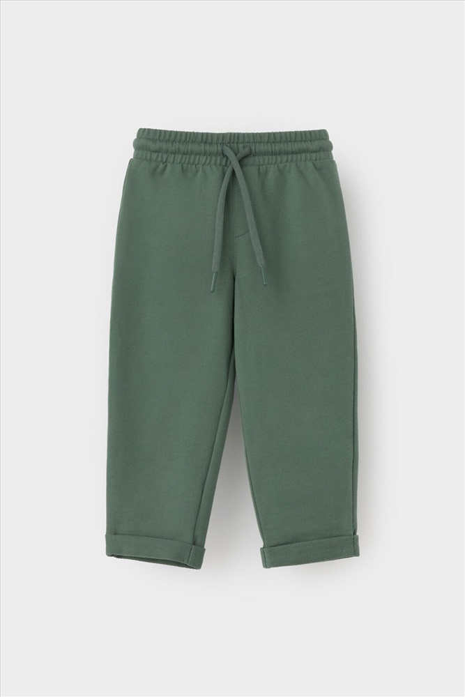 Трикотажные брюки для мальчика из петельчатого футера. Эластичный пояс на резинке регулируется по ширине с помощью шнурка, внизу отвороты.