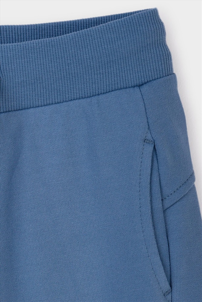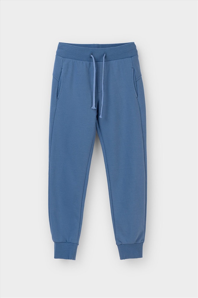 Трикотажные брюки для мальчика из петельчатого футера. Эластичный пояс на резинке регулируется по ширине с помощью шнурка, по бокам два удобных кармана, внизу эластичные манжеты.