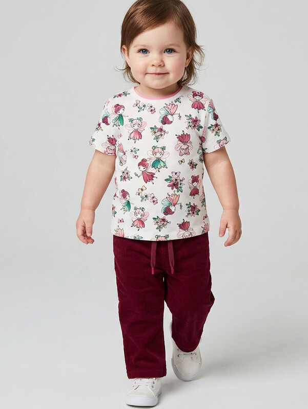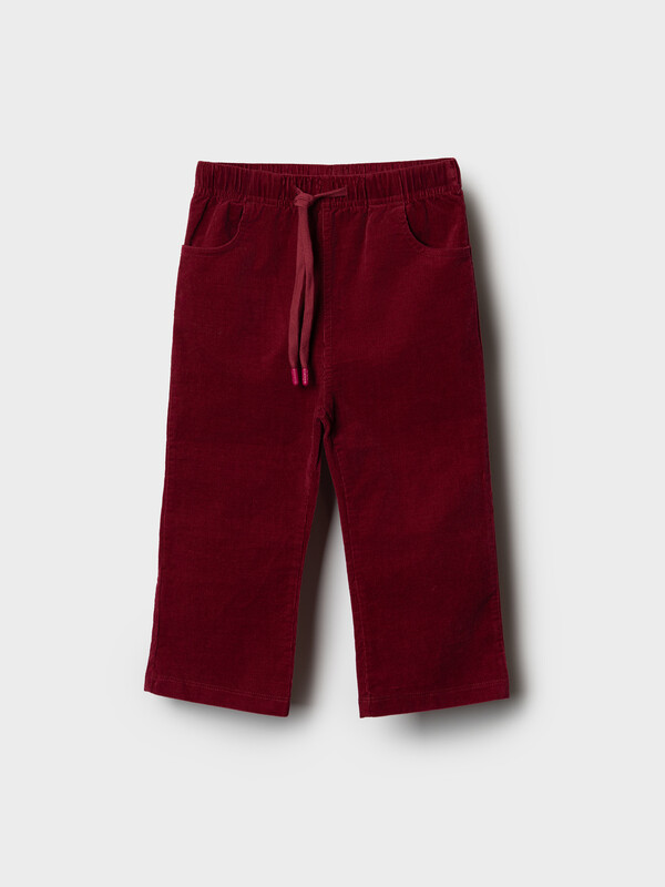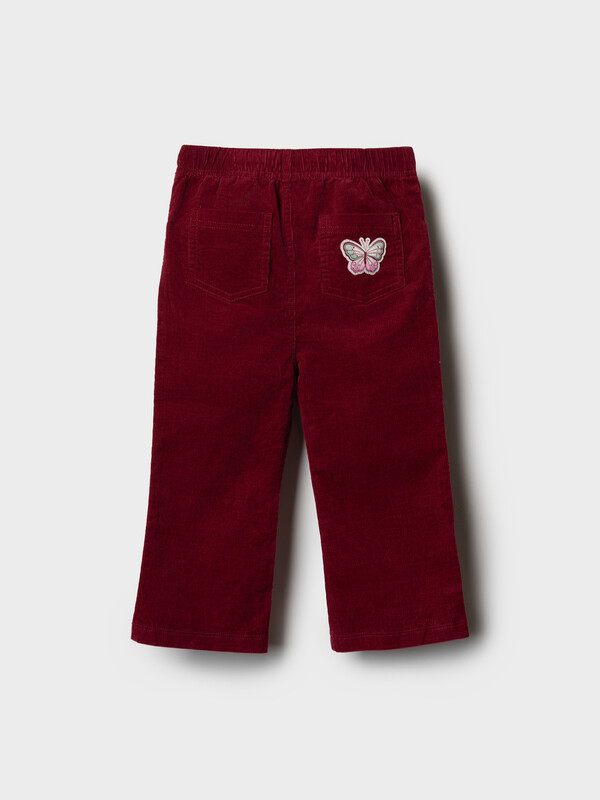 Детские брюки клеш для девочки. Модель из мягкой, хлопковой вельветовой ткани. Брюки с высокой посадкой и легким клешем от колена. Пояс на резинке дополнен шнурком для регулировки. Спереди расположены два боковых кармана, а сзади — два накладных, один из которых украшен симпатичной жаккардовой нашивкой.