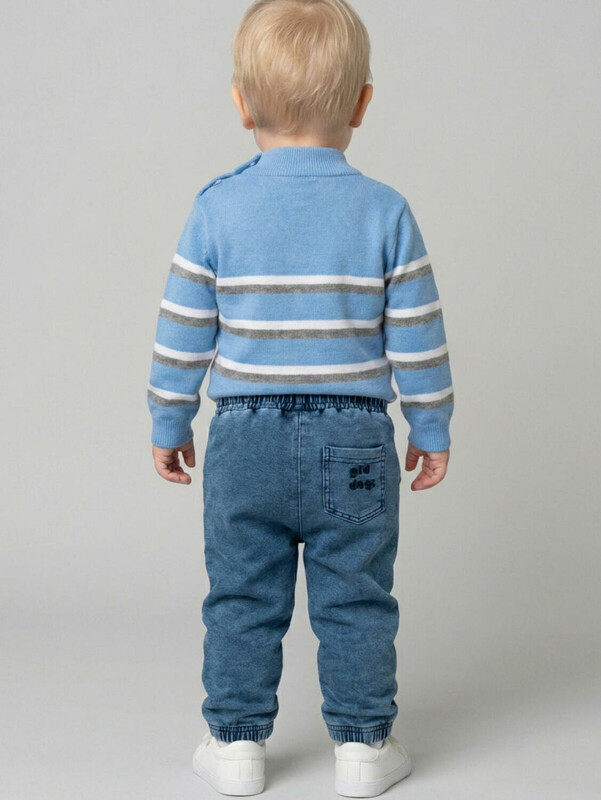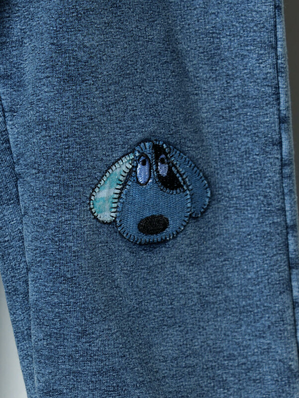 Детские брюки для мальчика. Модель прямого силуэта, выполнена из мягкого хлопкового трикотажа с эффектом денима. У брюк высокий комфортный пояс на широкой резинке и шнурок для регулировки. Спереди — два удобных кармана. Сзади один накладной карман. Декоративные аппликации с милыми собаками. В нижней части брючин предусмотрены эластичные трикотажные манжеты для лучшей посадки.