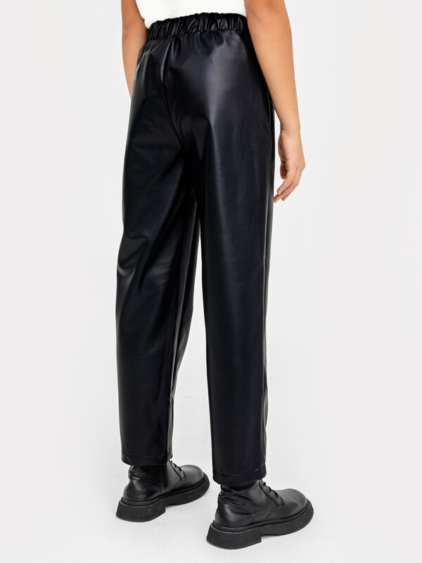 Брюки свободного силуэта. Посадка средняя. Пояс отрезной с эластичной тесьмой внутри. В боковых швах обработаны карманы. По низу брюк вытачки.