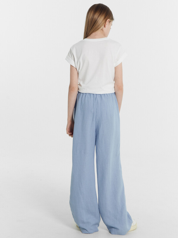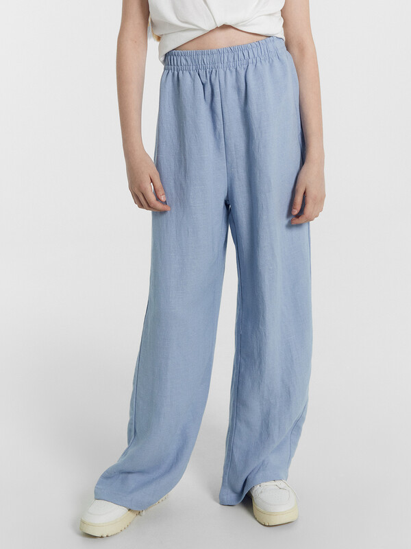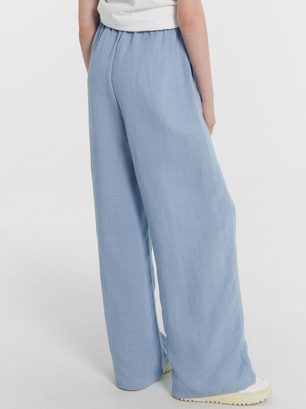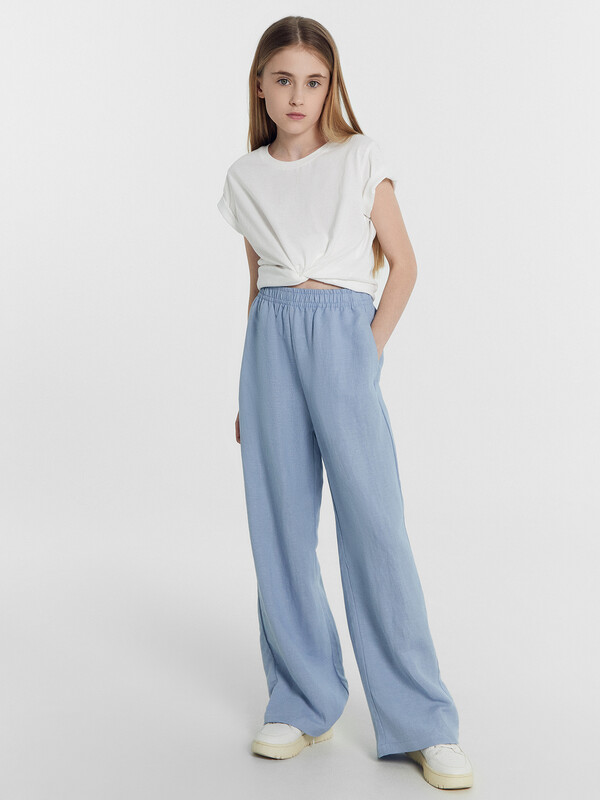 Брюки для девочек широкие. Посадка высокая. Пояс цельнокроеный из основного полотна, застрочен с эластичной тесьмой RV40 внутри, по поясу проложены отделочные строчки. В боковых швах обработаны карманы. Низ брюк обработан швом в подгибку.