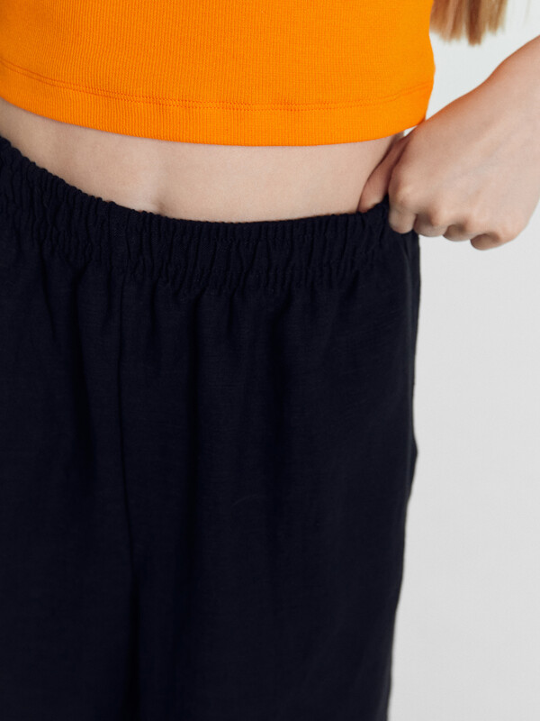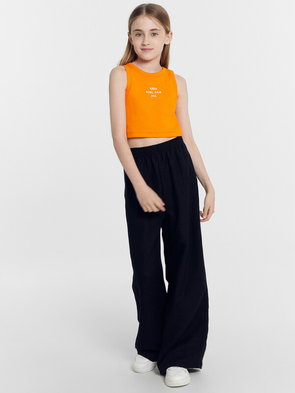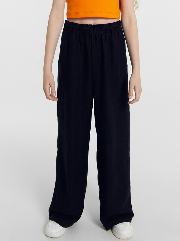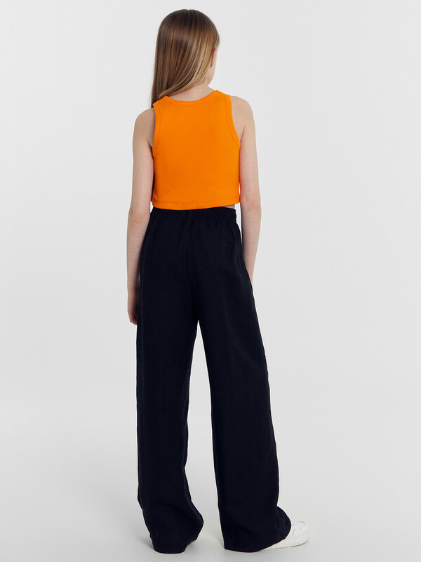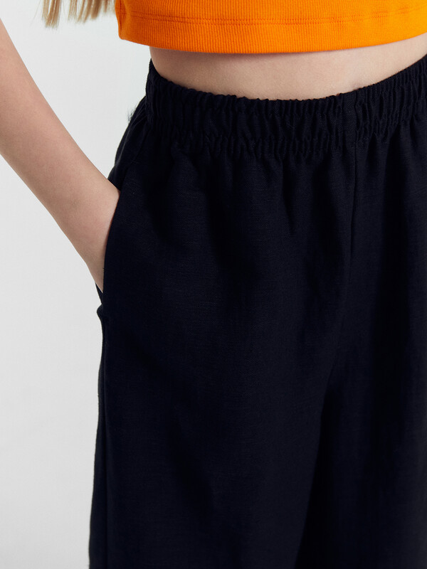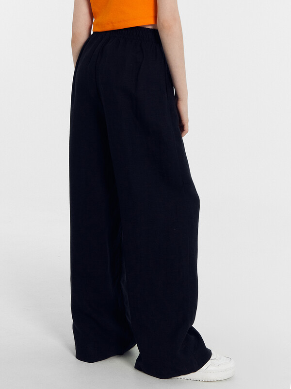 Брюки для девочек широкие. Посадка высокая. Пояс цельнокроеный из основного полотна, застрочен с эластичной тесьмой RV40 внутри, по поясу проложены отделочные строчки. В боковых швах обработаны карманы. Низ брюк обработан швом в подгибку.