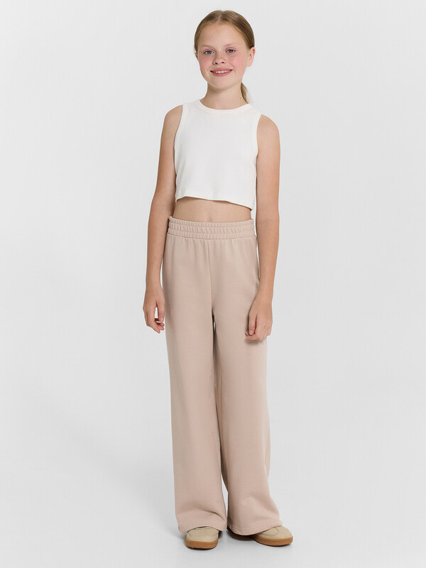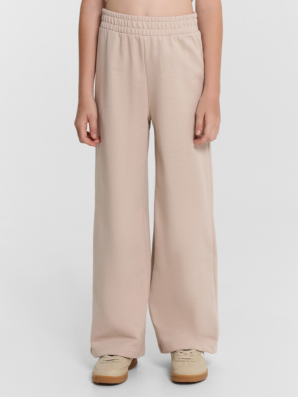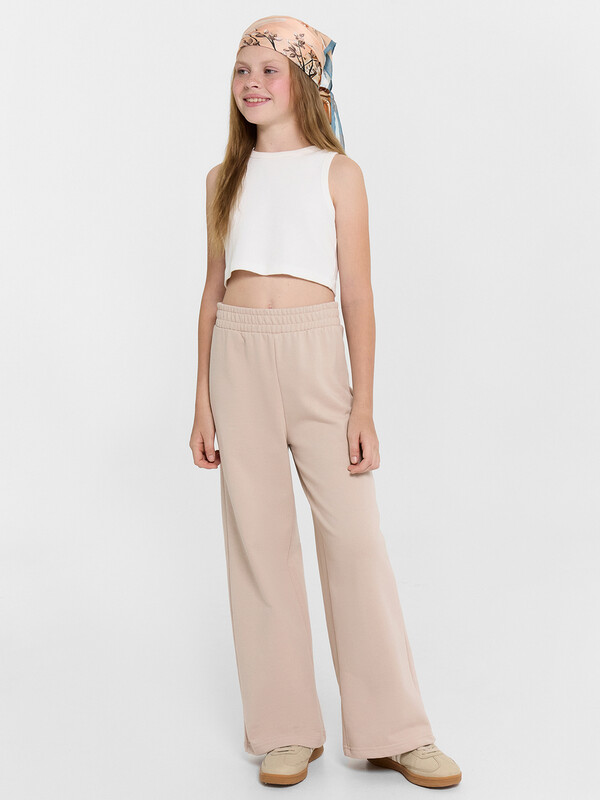 Брюки для девочек свободного силуэта. Пояс отрезной из основного полотна с эластичной тесьмой внутри 50RV. По поясу проложены отделочные строчки. Низ брюк обработан швом в подгибку.