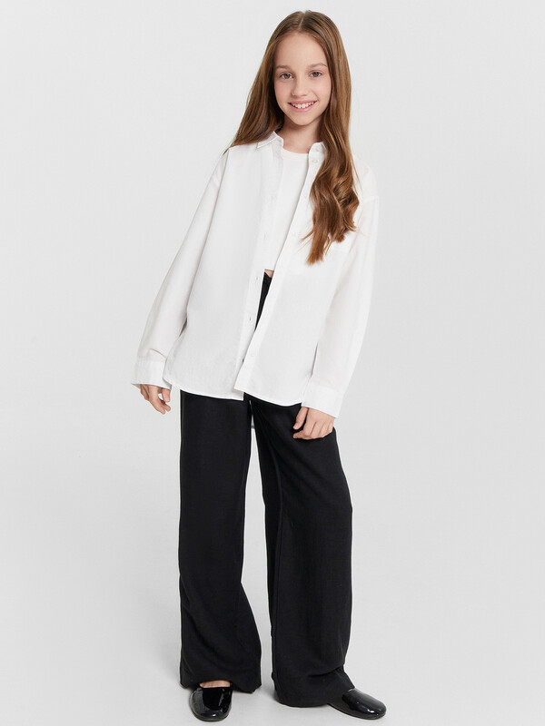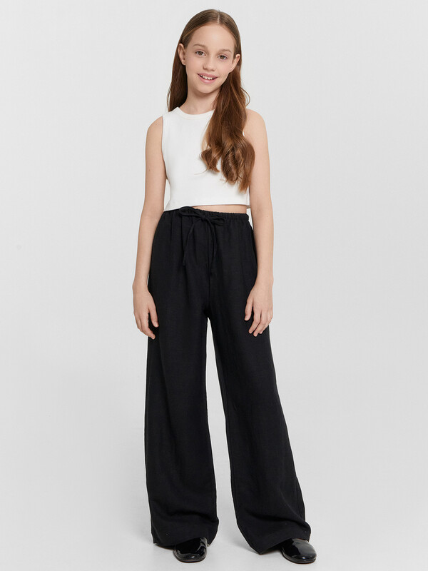 Производитель: Mark Formelle Брюки для девочек прямиго силуэта. Средняя посадка, пояс отрезной с эластичной тесьмой внутри 20RV. В поясе пробиты петли и втянут шнур из основного полотна.  Низ обработан швом в подгибку.