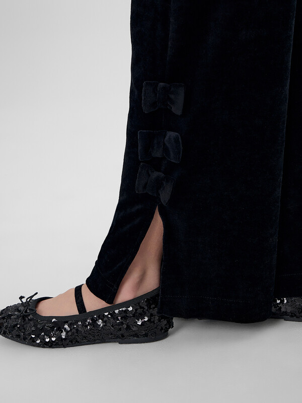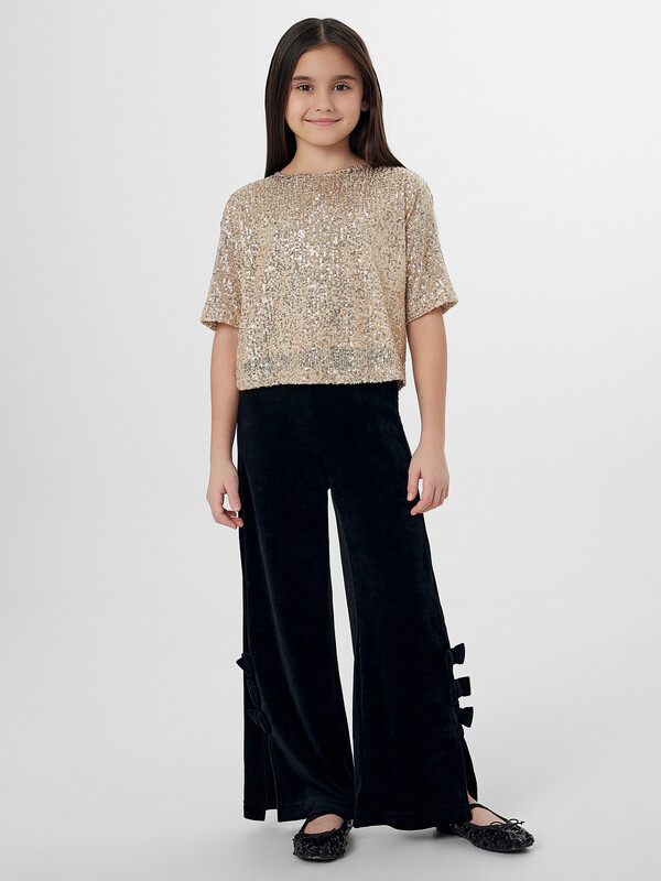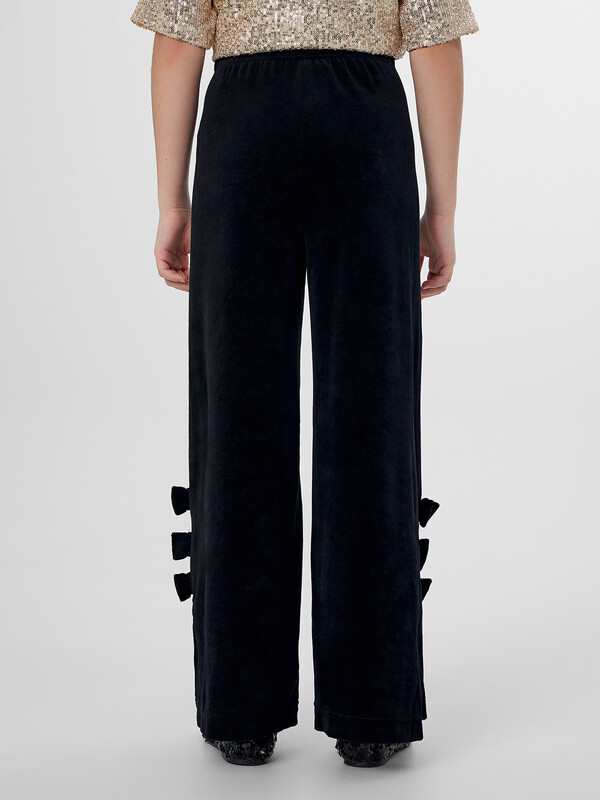 Брюки для девочек, с высокой посадкой, прямого силуэта. Пояс цельнокроеный с эластичной тесьмой внутри 30RV. Боковые швы с разрезами. Внизу, на боковом шве штанины расположено три бантика. Низ в подгибку