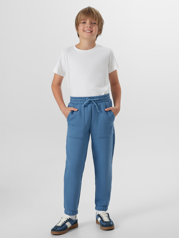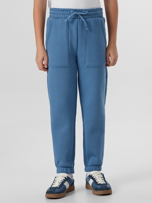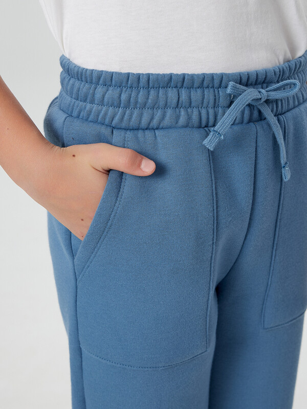 Посадка средняя. Пояс отрезной, внутрь пояса застрочена эластичная тесьма и шнур. По поясу идут две декоративные строчки. Боковые швы перенесены вперед. На передних деталях накладные карманы с наклонным входом от боковых швов. По низу изделия внутрь застрочена эластичная тесьма.