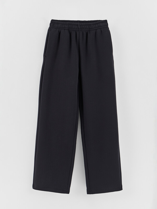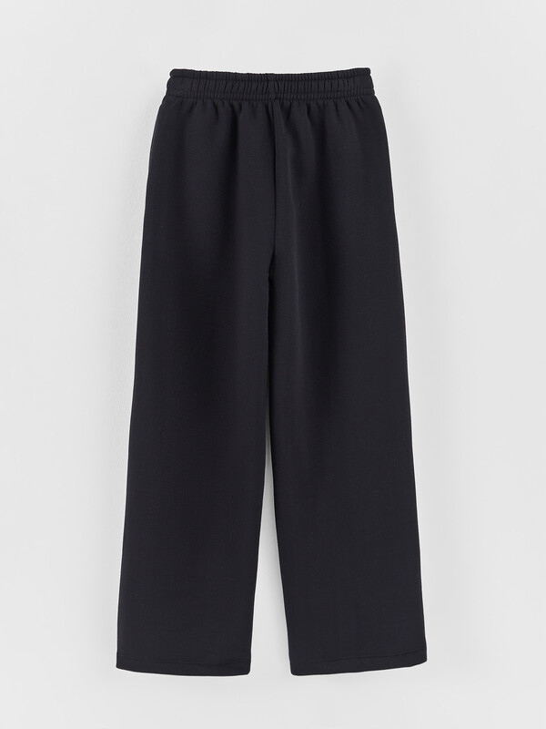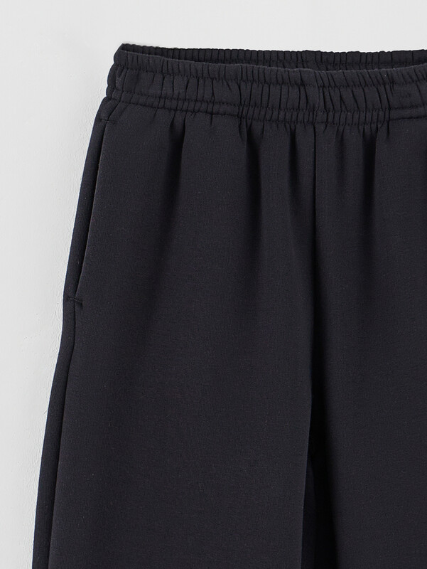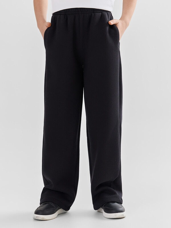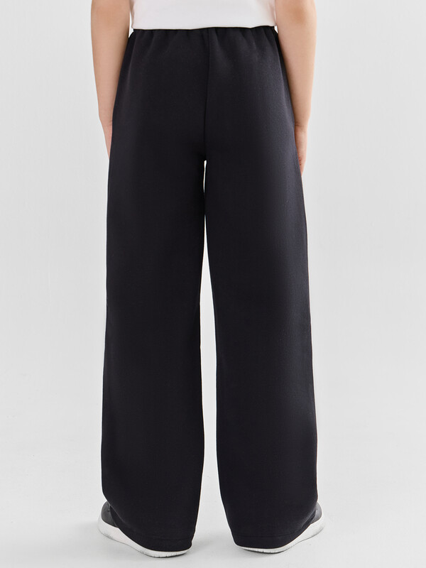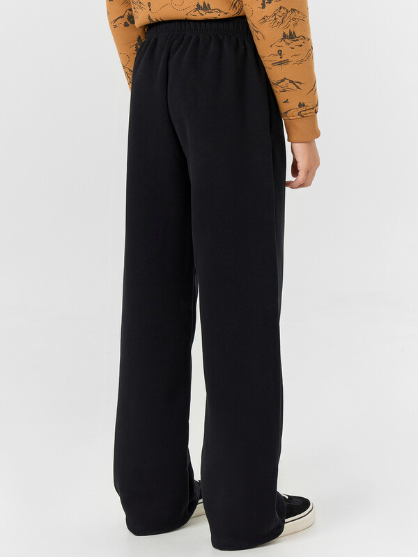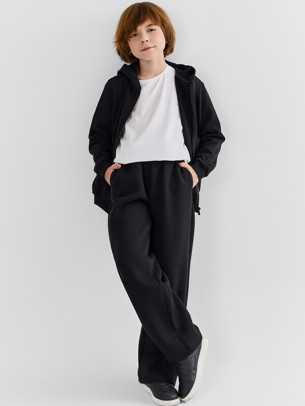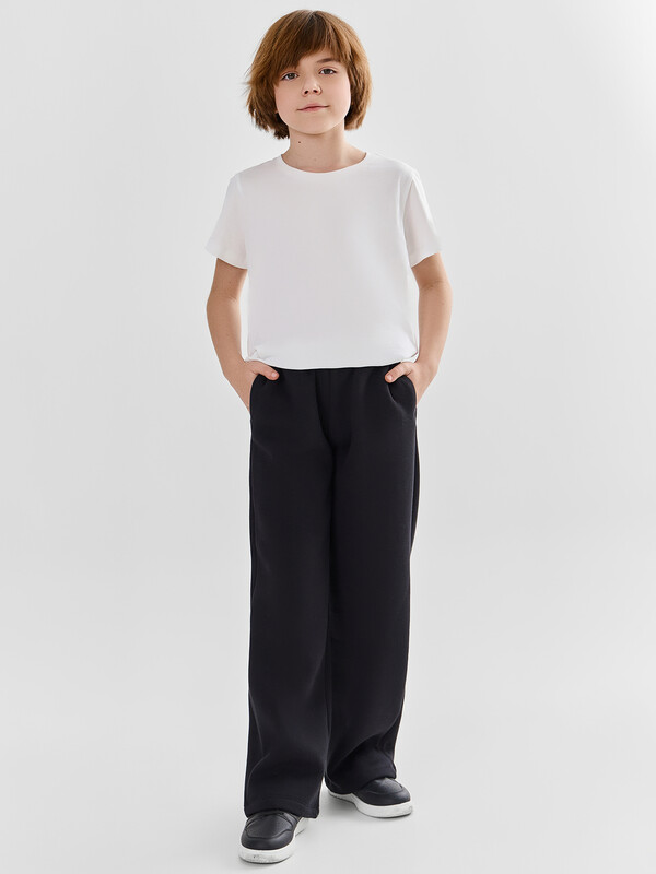Брюки для мальчиков, прямого силуэта. Пояс цельнокройный с втачной эластичной тесьсьмой. Пояс прострочен двумя отделочными строчками. По переду обработаны карманы в швах. Низ брюк обработан швом в подгибку на двухигольной плоскошовной машине.
