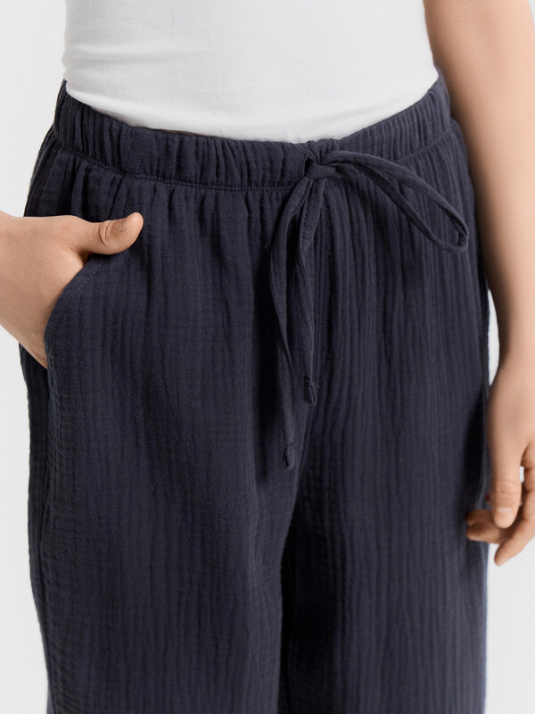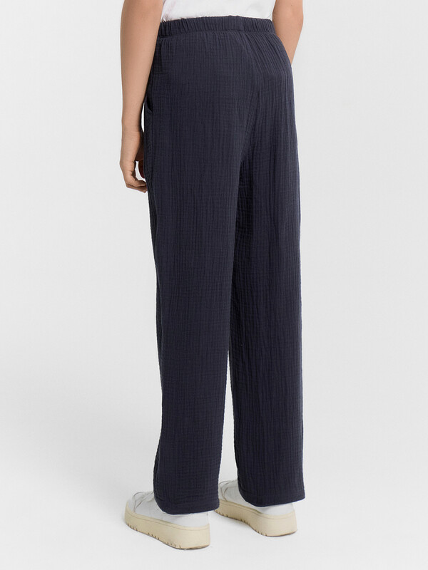 Низ брюк обработан швом в подгибку.