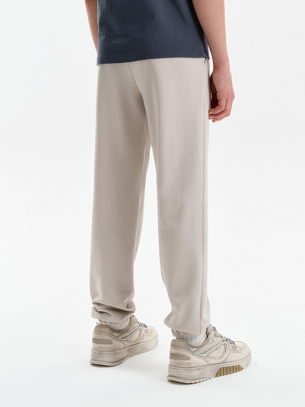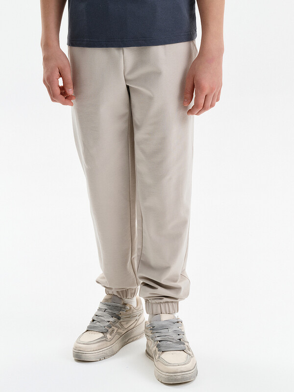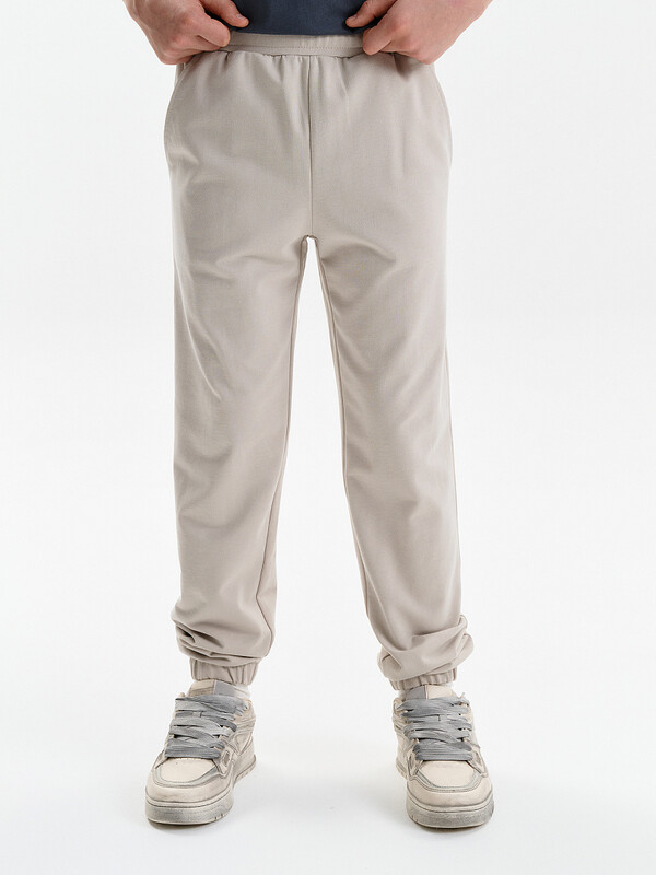 Брюки для мальчика на резинке из тонкого трикотажа. Комфортные спортивные штаны для мальчика свободного силуэта, по низу брюк тунельная резина. Пояс из основной ткани, внутри широкий эластик, прострочен двумя строчками. Брюки с карманами выполнены из футера. Внутренняя утяжка по поясу шнурком.