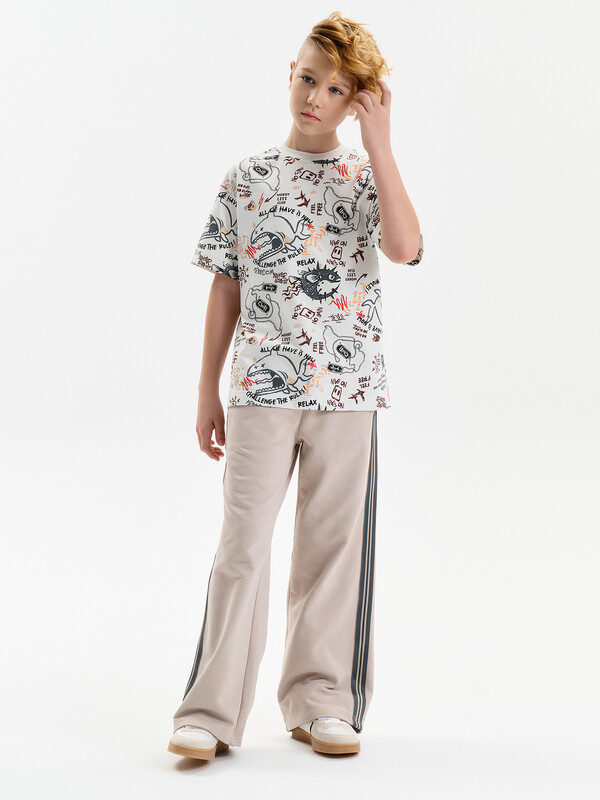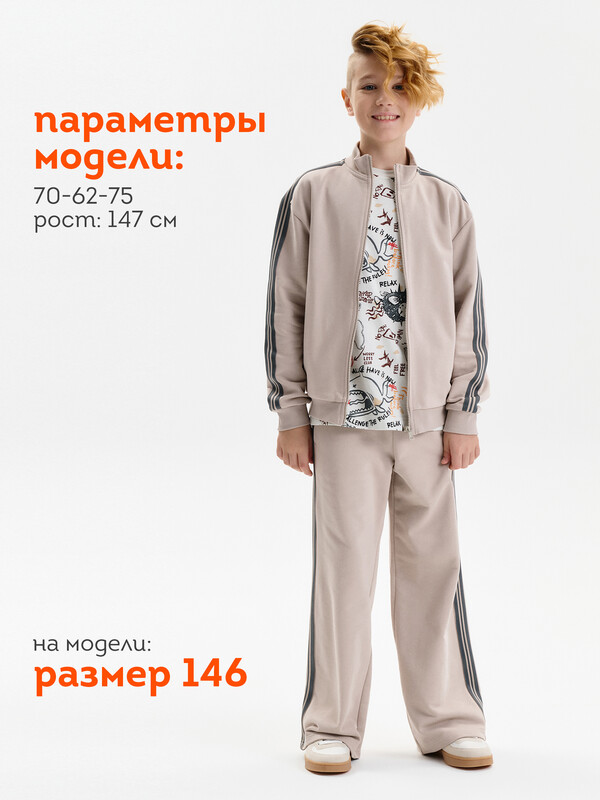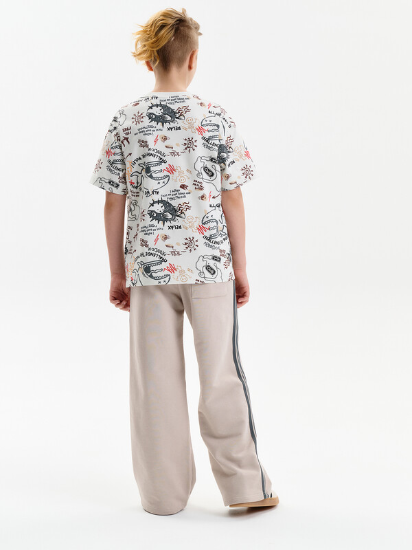 Широкие прямые брюки для мальчика из футера плотностью 350 гр/кв.м. Карманы в боковых швах. На задней половинке брюк справа накладной карман. Пояс из основной ткани, внутри широкий эластик, прострочен двумя строчками. В поясе внутренняя утяжка на шнурок. По бокам трикотажные лампасы.