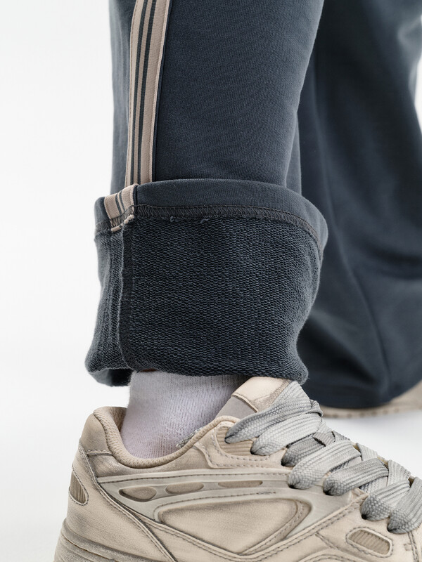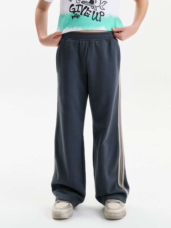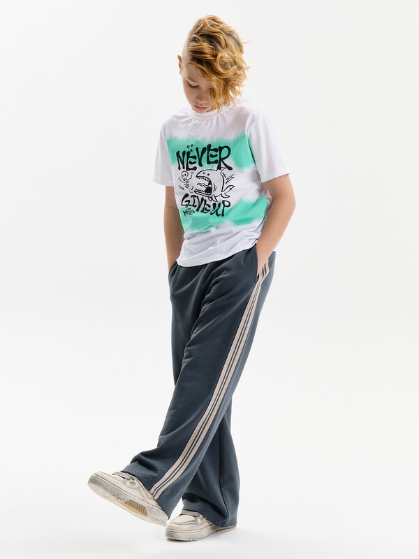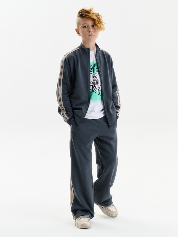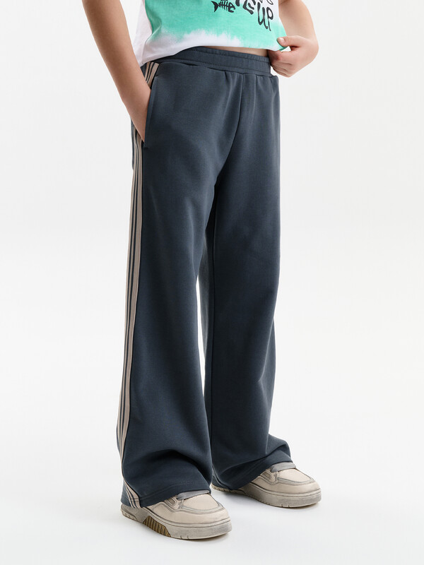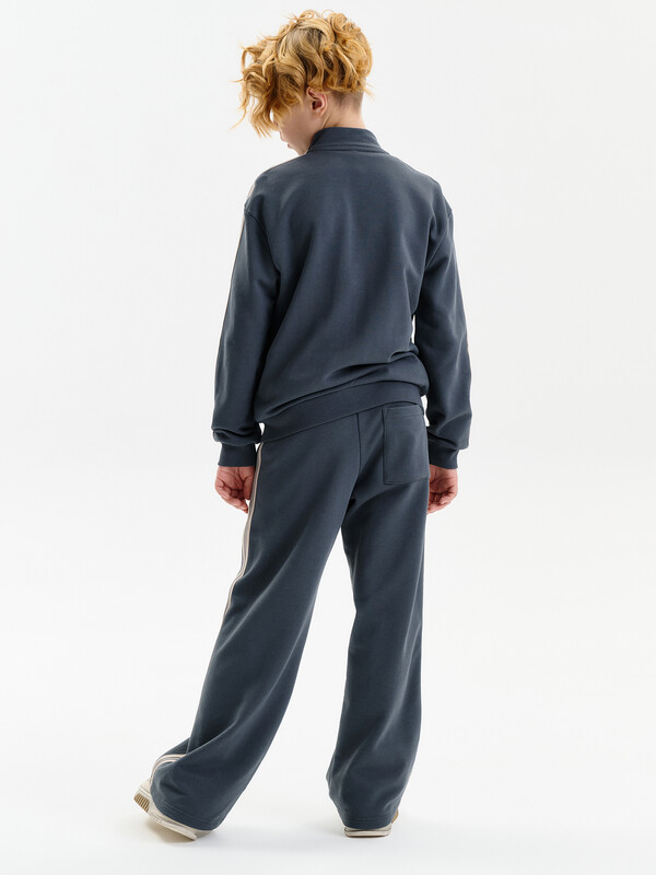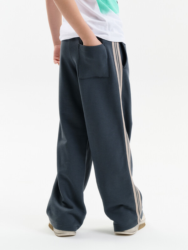Широкие прямые брюки для мальчика из футера плотностью 350 гр/кв.м. Карманы в боковых швах. На задней половинке брюк справа накладной карман. Пояс из основной ткани, внутри широкий эластик, прострочен двумя строчками. В поясе внутренняя утяжка на шнурок. По бокам трикотажные лампасы.