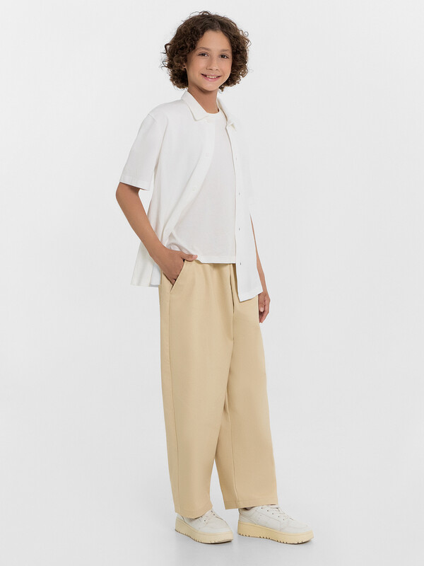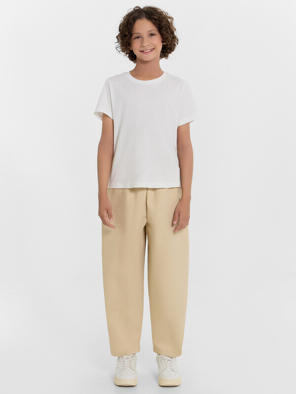 Брюки прямые свободные (оверсайз), слегка зауженные к низу. Сидение спущено.