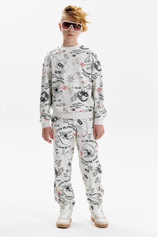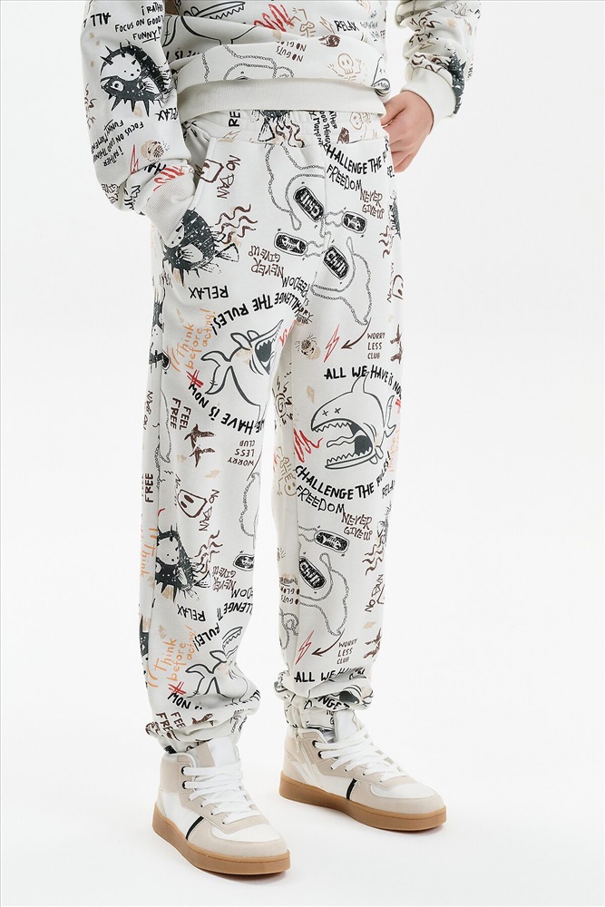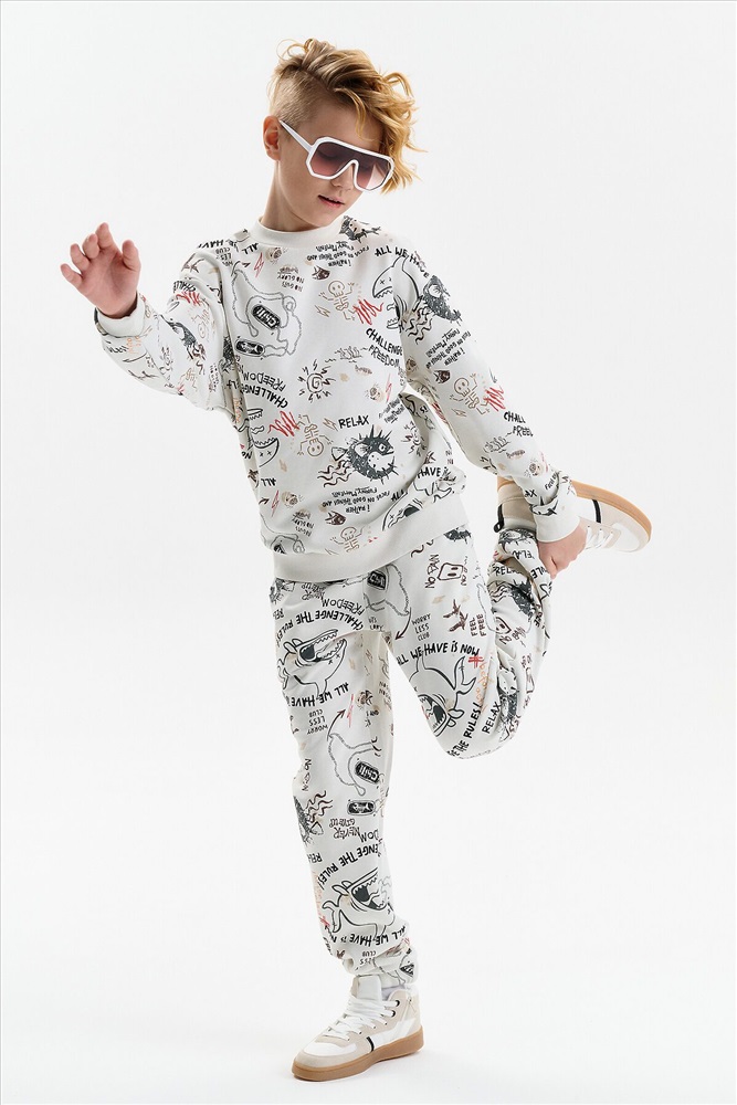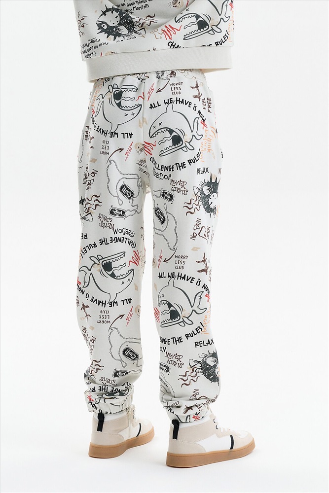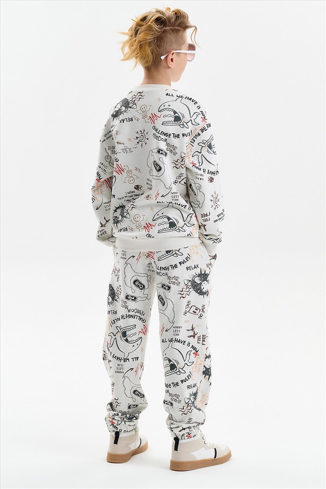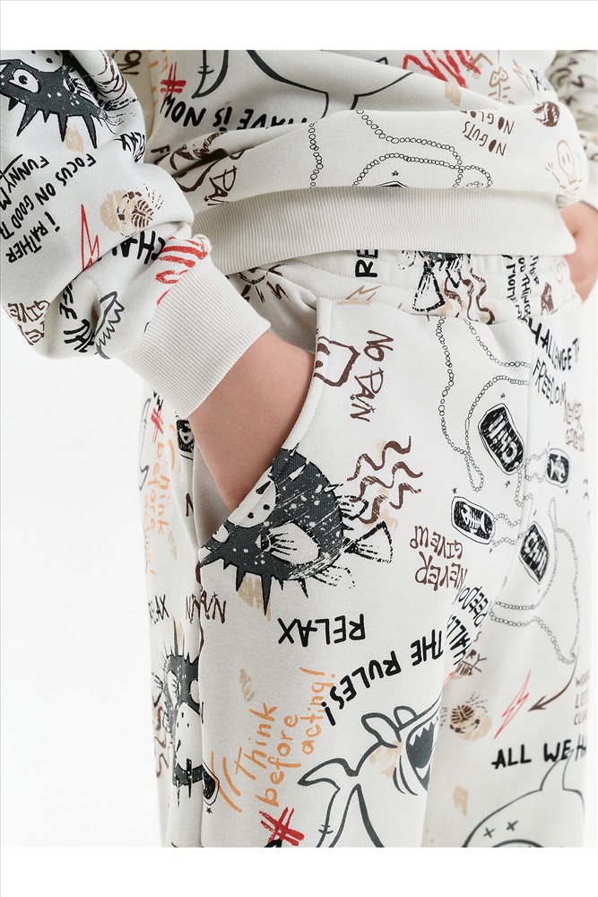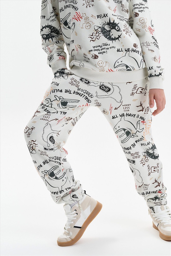 Брюки для мальчика на резинке из плотного футера, плотность 310 гр/кв.м.. Комфортные спортивные штаны для мальчика свободного силуэта, по низу брюк тунельная резина. Пояс из основной ткани, внутри широкий эластик, прострочен двумя строчками. Брюки с карманами выполнены из футера. Внутренняя утяжка по поясу шнурком. Перевод текстов: Нет смелости — нет славы: Нет боли — нет выгоды: Не стесняйся: Всё, что у нас есть — это сейчас: Бросай вызов правилам: Свобода: Клуб «Меньше беспокойства»: Лучше сосредоточься на хороших вещах и забавных моментах: Расслабься: Никогда не сдавайся: Думай, прежде чем действовать.