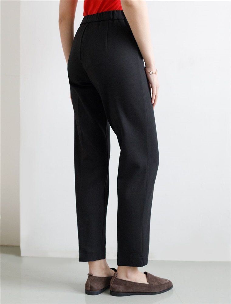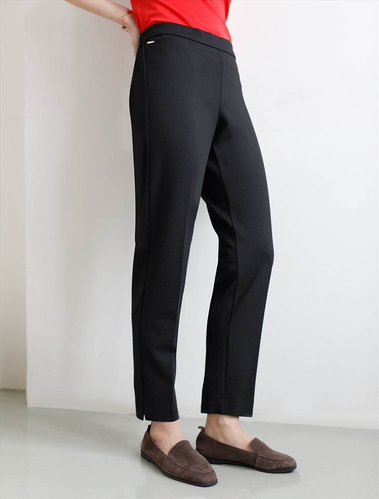 Брюки-дудочки выполнены из джерси. Модель дополнена резинкой сзади, одним вместительным карманом спереди и небольшими боковыми разрезами. Заутюженные стрелки и посадка на талии визуально вытягивают силуэт. Изделие хорошо держит форму, отлично тянется и почти не мнется во время использования. Идеальный вариант в офис или в повседневный классический стиль.