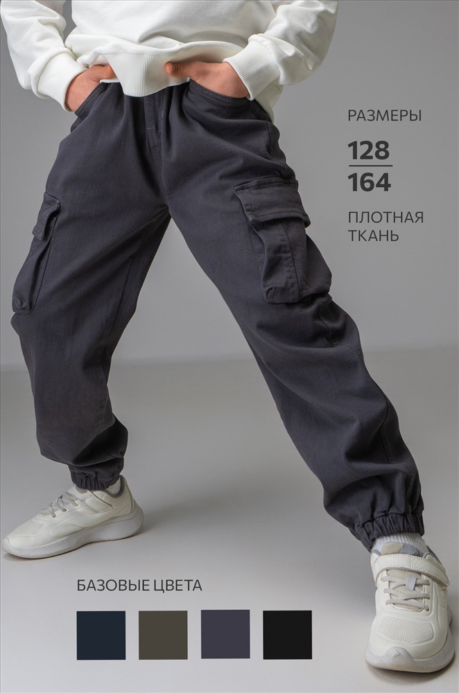 Тренды подростковой моды! Стильные брюки джоггеры для мальчиков и подростков выполнены из ткани габардин. Практичные брюки с большими накладными карманами идеальны на каждый день. Подростковые брюки карго свободного кроя, эластичный пояс регулируется шнурком, низ штанин собран на резинку.