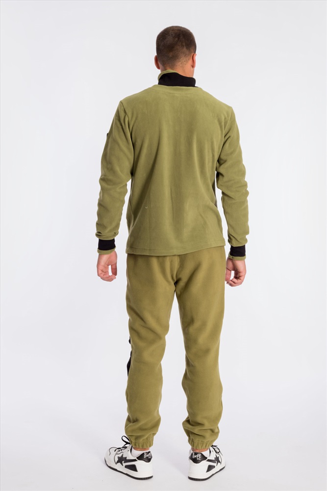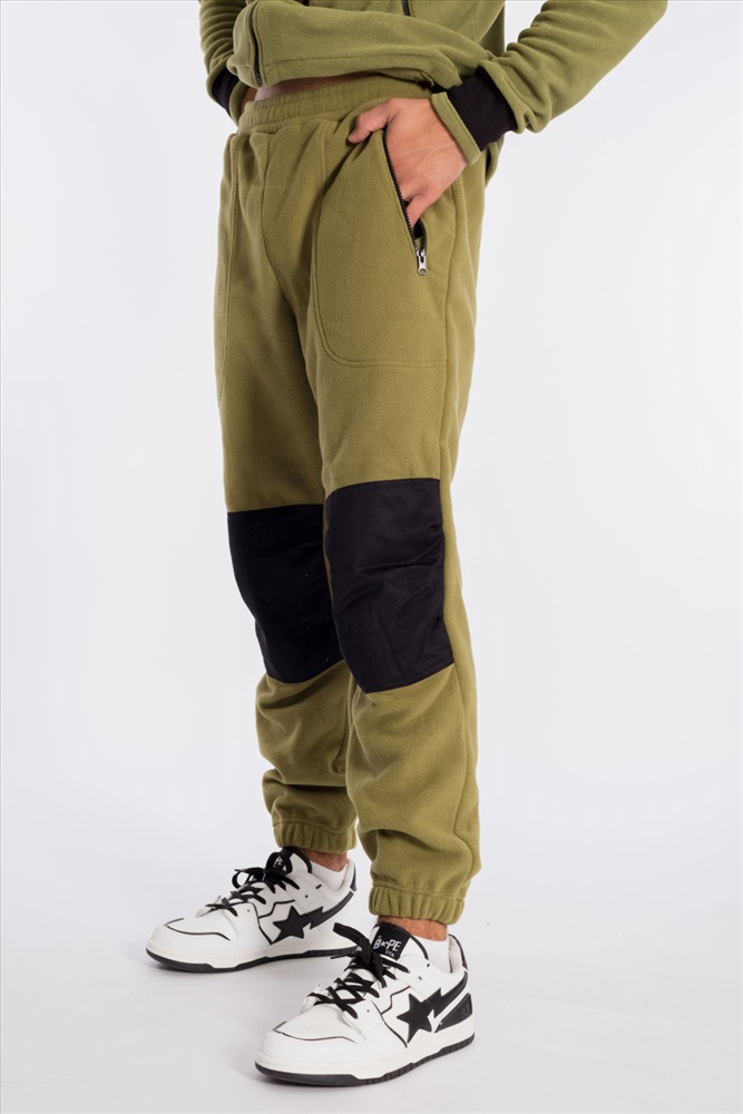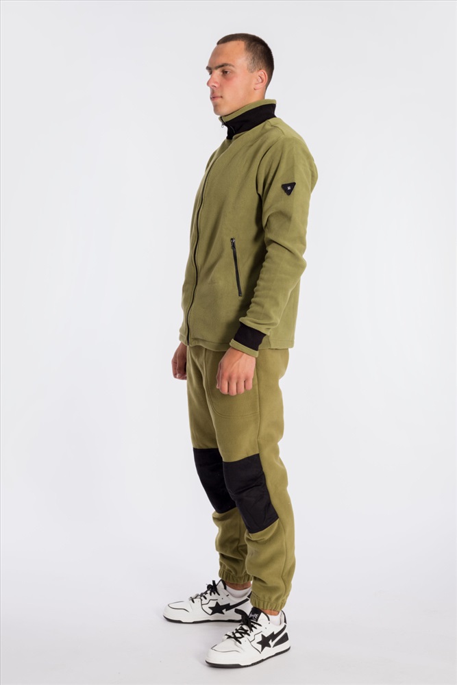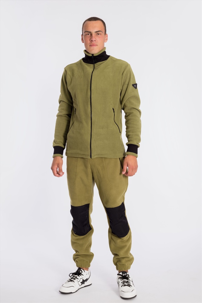 Цвет Номенклатуры: хаки Брюки из однотонного флиса с наколенниками из износостойкой, плотной саржи. Пояс и низ брюк на резине. Ширина пояса изнутри регулируется при помощи шнура. По бокам размещены карманы на молнии.