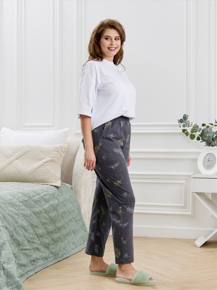 Состав: 100% хлопок Ткань: Кулирка Кулирка - это самое гладкое и тонкое трикотажное полотно из чистого хлопка. С лицевой стороны ткань «кулирка» выглядит как «вертикальные косички», орнамент изнаночной стороны напоминает «кирпичную кладку». Свойства кулирного трикотажа- воздухопроницаемость, гигроскопичность, не теряя своей формы, практически не тянется в длину и хорошо растягивается в ширину, не образует складки. Брюки женские из трикотажного полотна «кулирка» с набивным рисунком, прямого кроя слегка зауженные книзу, с карманами в боковых швах, на притачном поясе с эластичной тесьмой внутри.