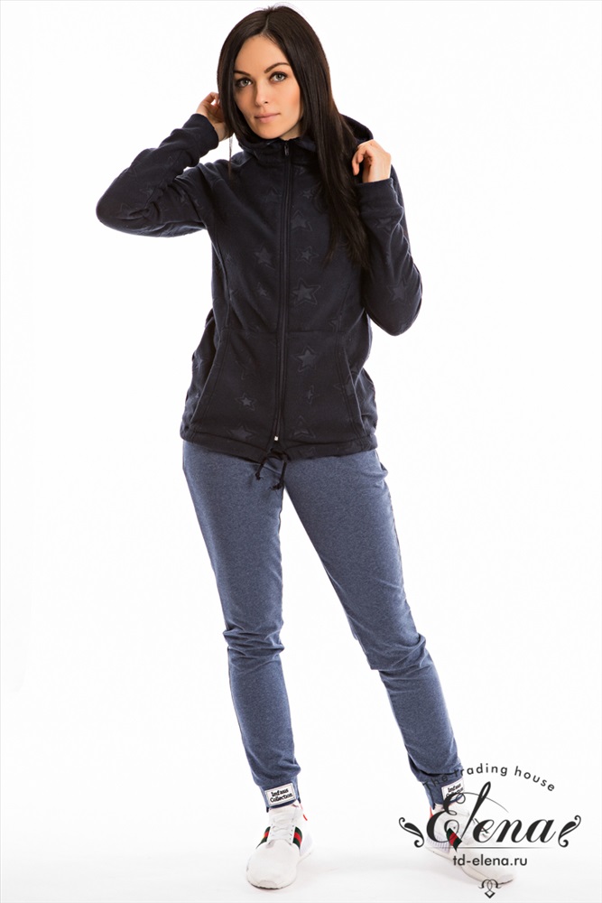 Цвет Номенклатуры: индиго Спортивные брюки из футер петли с лайкрой. Зауженный покрой к низу, пояс на резинке, по бокам расположены карманы. Через петли в поясе продернут шнур. На передних частях манжет расположены нашивки.