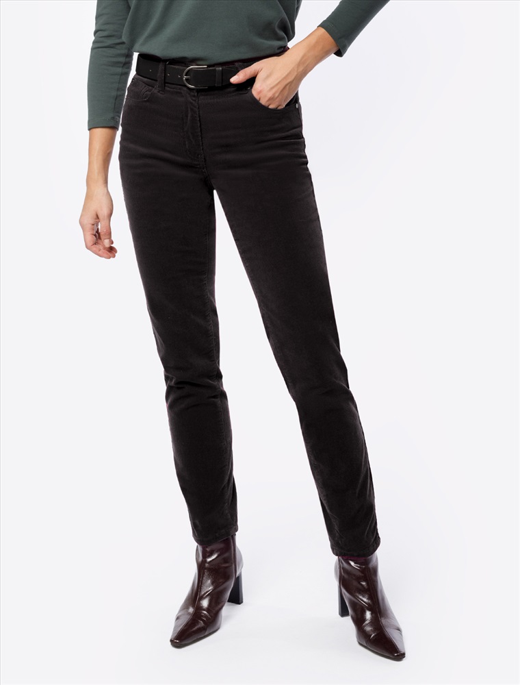 Брюки выполнены из мягкого хлопкового микро-вельвета с добавлением эластана. Изделие комфортно садится по фигуре и не сковывает движения. Модель с пятью карманами, как у джинсов-скинни дополнена высококачественной фурнитурой с фирменным логотипом бренда. Хорошо комбинируется с вязаным трикотажем, блузками и денимом. Как альтернатива брюкам, в нестрогий офисный дресс-код.