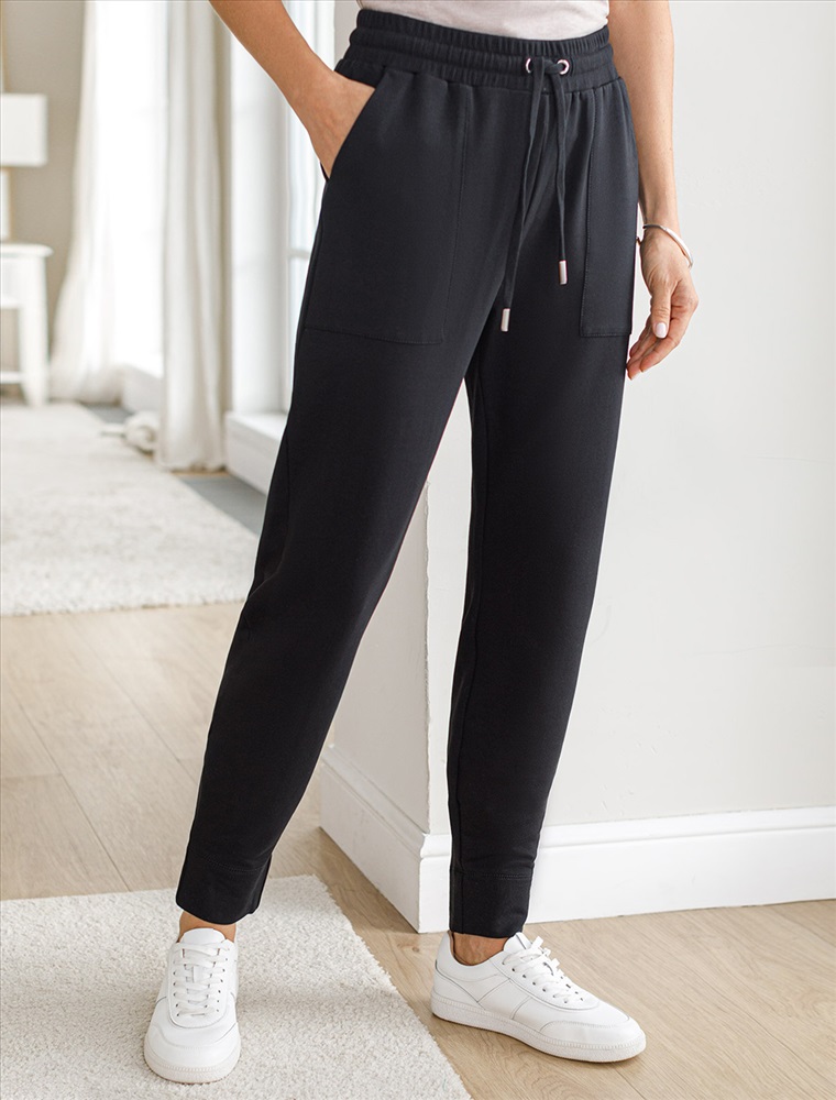 Брюки выполнены из футера двухнитки с эластаном. Модель зауженная к низу дополнена карманами и эластичным поясом с фактурой в рубчик. В пояс вставлен плоский хлопковый шнур в тон изделия с серебристыми наконечниками. Изделие дополнено металлическим логотипом бренда. Сочетается в костюме с жакетом D49.078, джемпером D49.079, D49.080 и футболкой D49.081