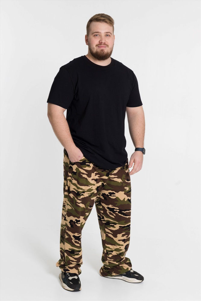 Цвет Номенклатуры: камуфляж Брюки мужские из хлопкового полотна (камуфляж). Прямого кроя, с карманами по бокам. Пояс брюк на резине.