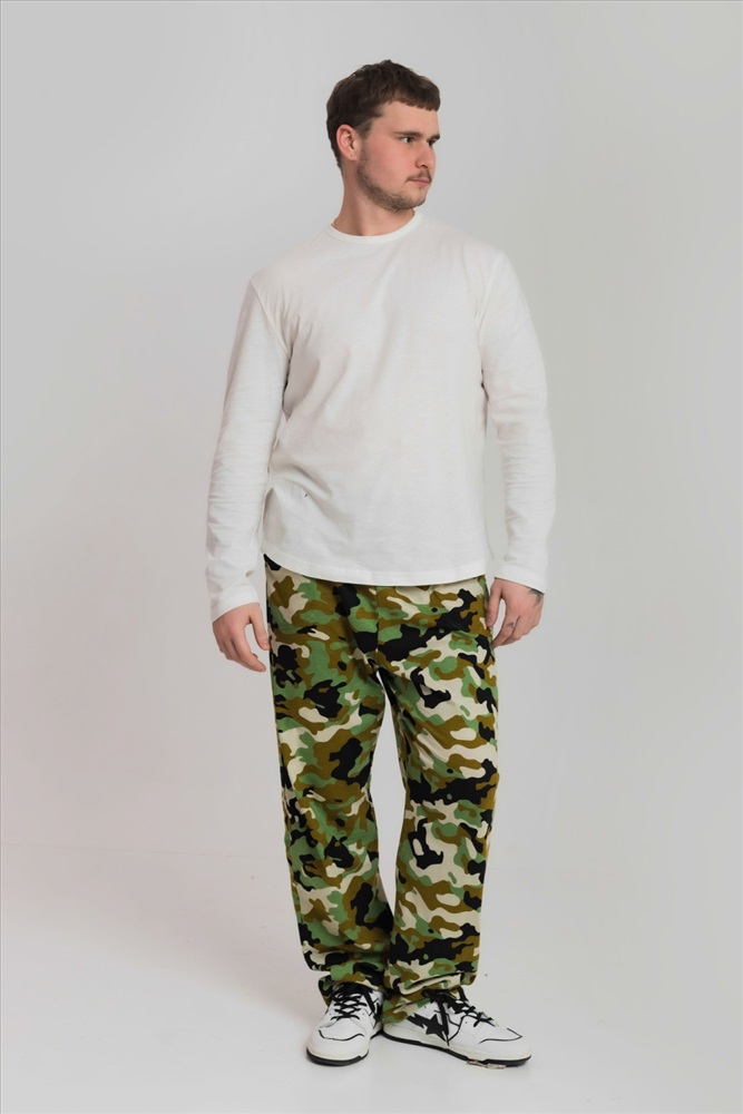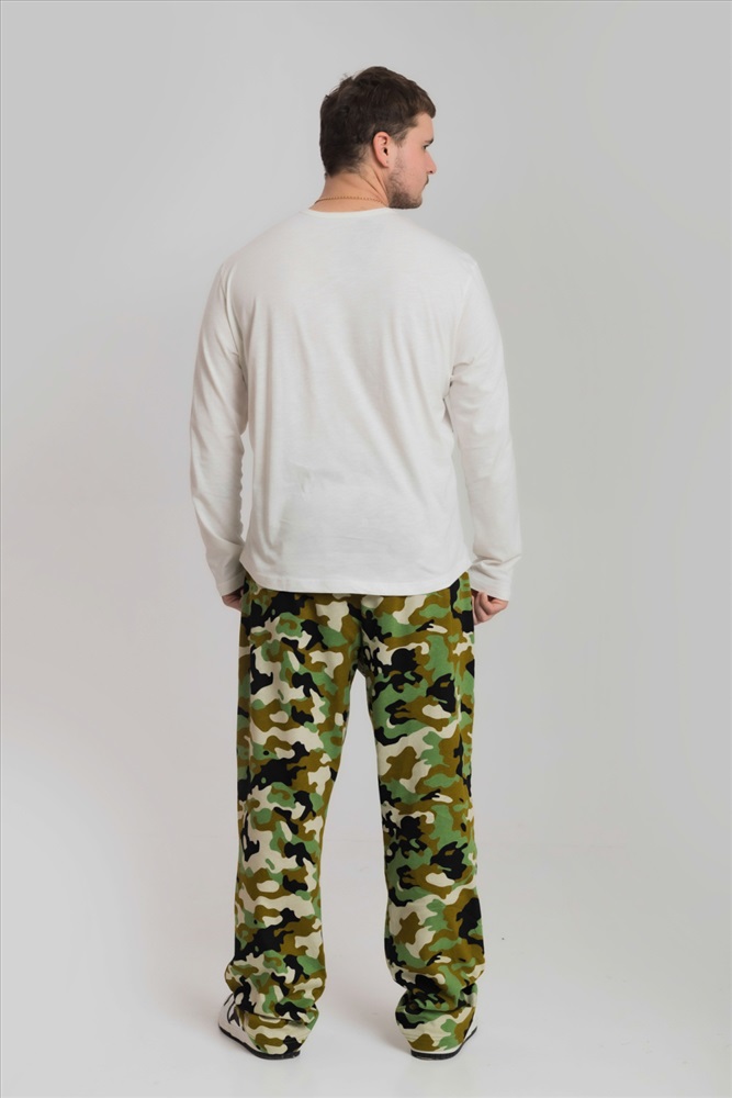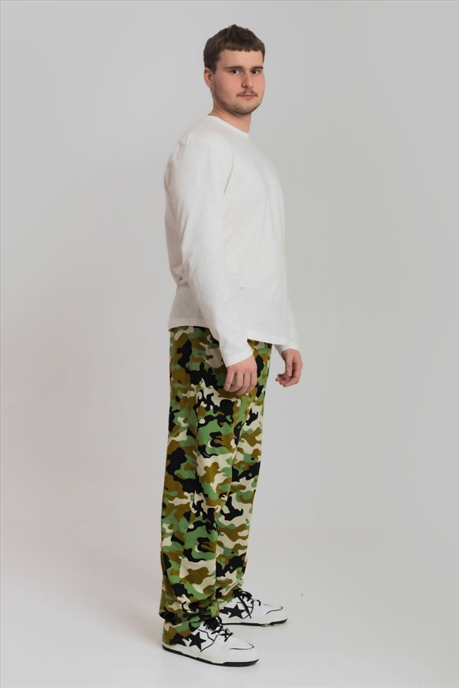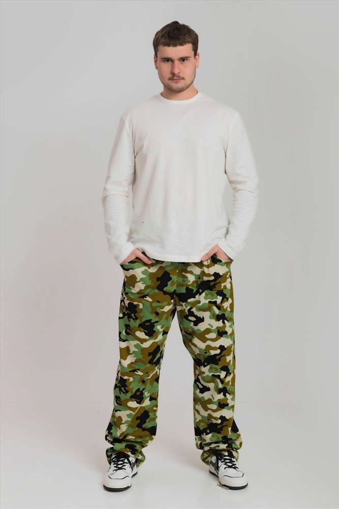 Цвет Номенклатуры: зеленый/черный Брюки мужские из хлопкового полотна (камуфляж). Прямого кроя, с карманами по бокам. Пояс брюк на резине.