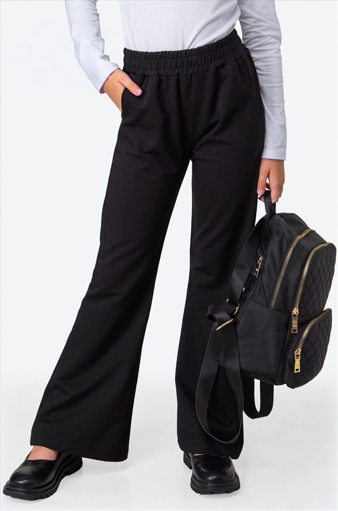 В школу – элегантной походкой! Стильные трикотажные брюки клеш для девочки и девочки-подростка выполнены из ткани футер черного цвета. Детские расклешенные брюки с высокой посадкой, пояс на эластичной резинке, по бокам предусмотрены удобные карманы.
