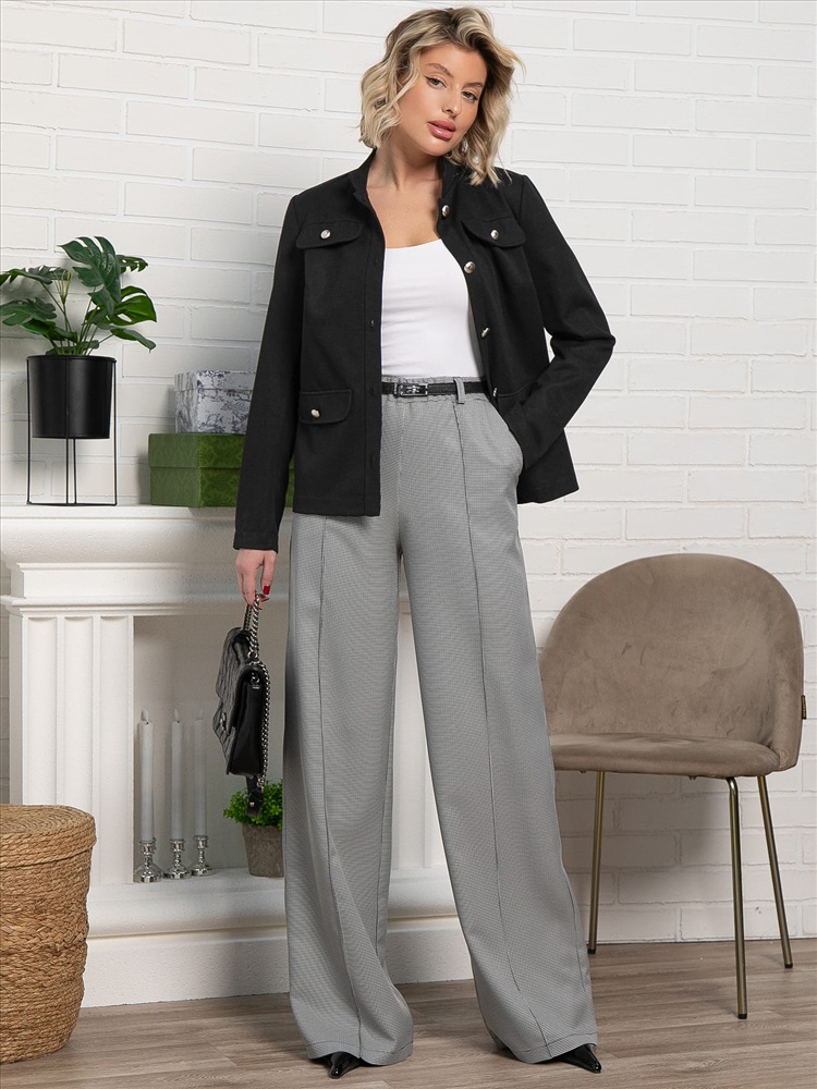 Женские брюки в черно-белом цвете с принтом «гусиная лапка» — стильный и универсальный предмет гардероба. Прямой свободный крой обеспечивает комфорт и свободу движений. По талии резинка. В боковых швах расположены карманы, а по переду — аккуратные стрелки, придающие брюкам элегантный силуэт. Идеально подходят для создания как деловых, так и повседневных образов.