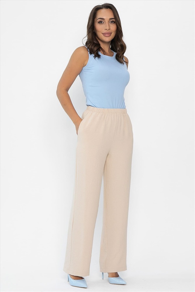 Состав : 83% полиэстер, 12% вискоза, 5% эластан Материал : костюмный "Сингапур" Цвет : Бежевый Принт : отсутствует Карманы : Есть Резинка в поясе : Да Вид застежки : без застёжки Тип посадки брюк : Высокая Пояс брюк : притачной Крой брюк : свободный Фасон брюк : классические Декоративные элементы : отсутствуют Длина готового изделия по внутреннему шву : 44-80 см, 46-79.5 см, 48-79 см, 50-79 см, 52-78 см Длина готового изделия по боковому шву : 44-111 см, 46-111.3 см, 48-111.5 см, 50-111.7 см, 52-112.7 см