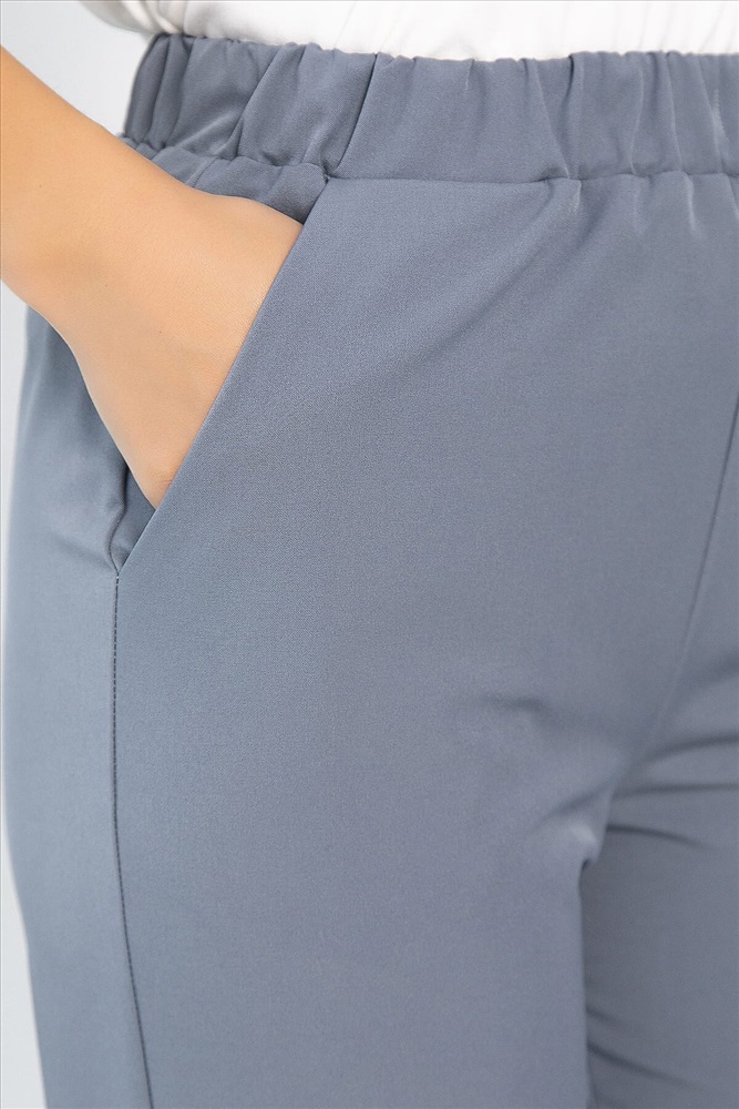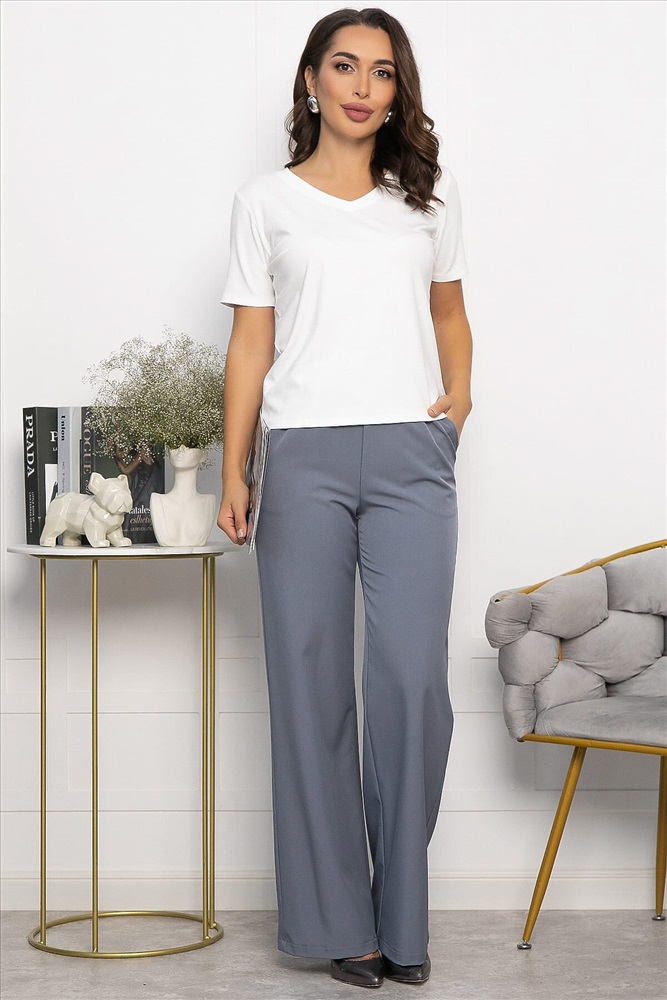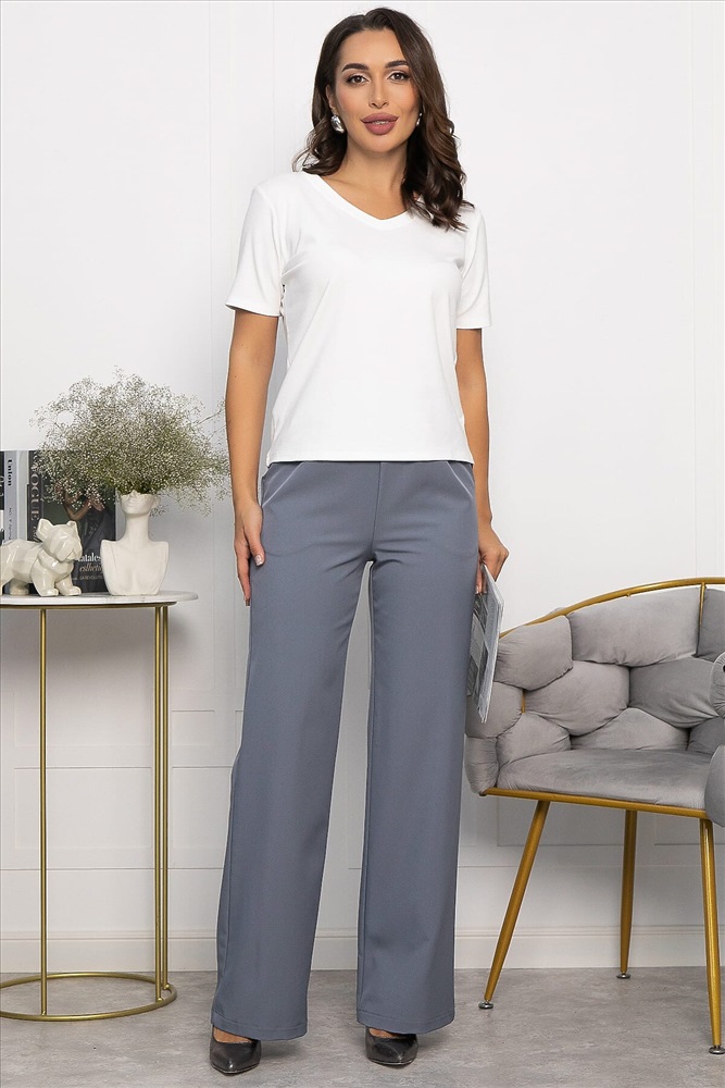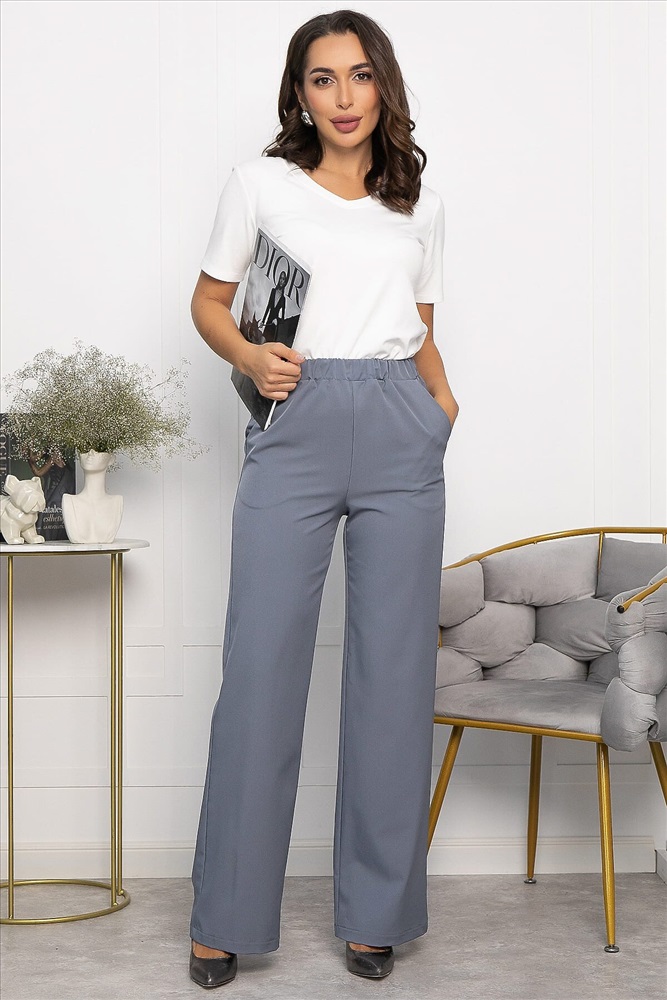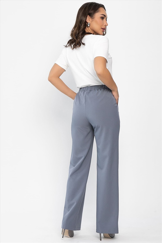 Классические брюки в серо-голубом цвете на резинке по талии подойдут для офисного и повседневного образа. Они не сковывают движений и выглядят стильно и лаконично. В боковых швах брюк есть удобные карманы. Универсальная длина. Брюки отлично смотрятся в сочетании с классическими рубашками или блузами, а также подойдут для создания расслабленного образа.