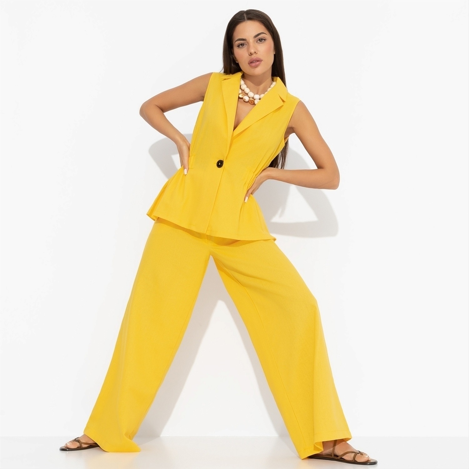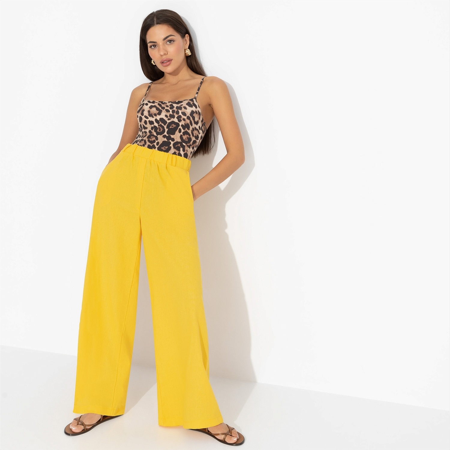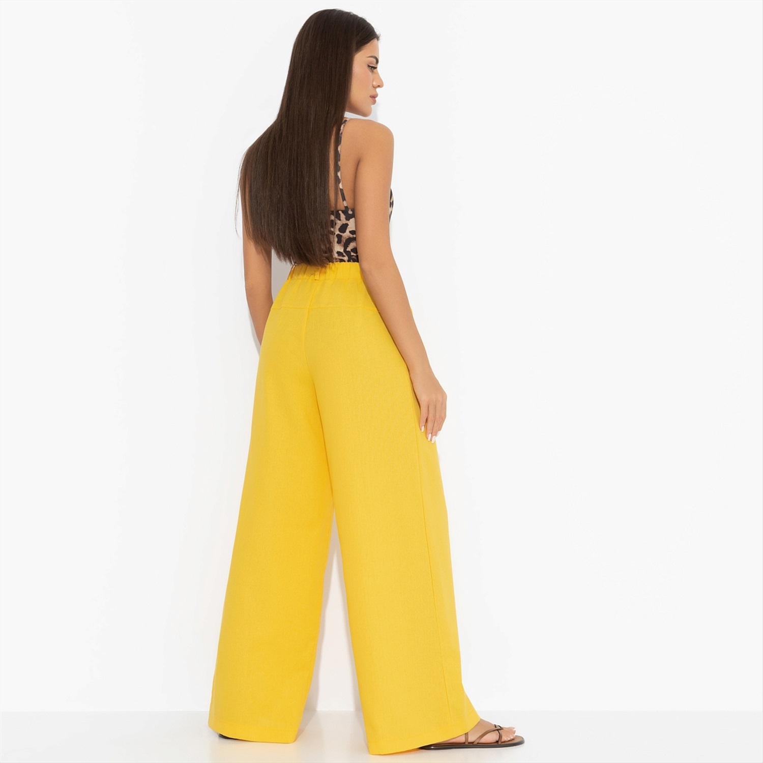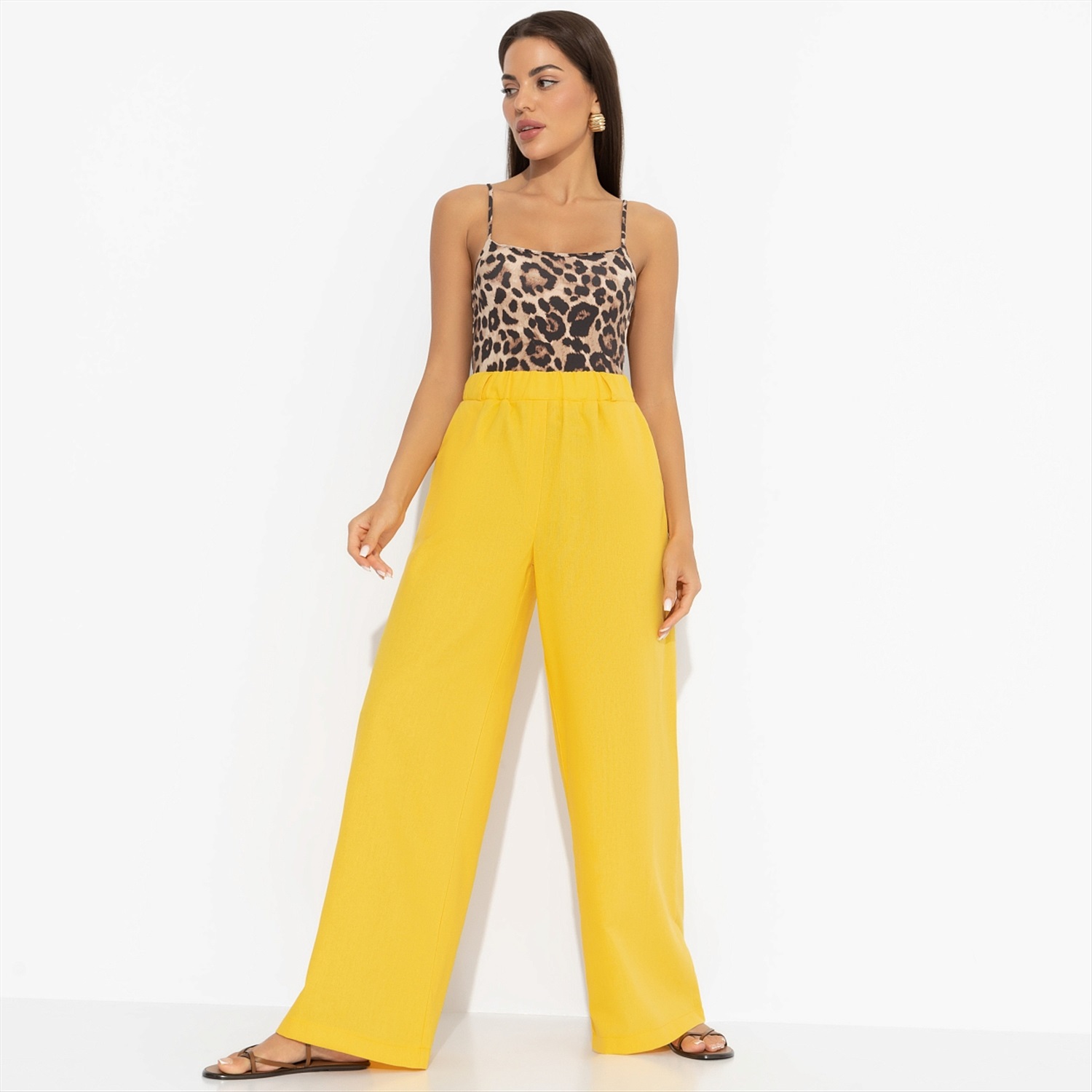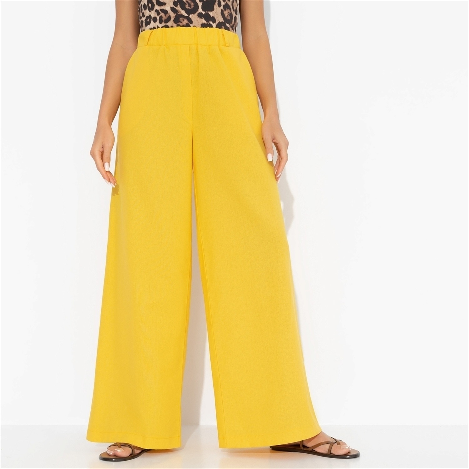 Состав: Лен вискозный (65% лен, 35% п/э) Плотность ткани: Средняя Тип ткани: Текстиль Вид застежки: Нет Высота посадки: Высокая Карманы: В боковом шве Основной цвет ткани: Жёлтый Подклад: Нет Резинка по талии: Есть Рисунок/раппорт: Нет, все изделия идентичны Сезон: Лето Стиль: Классический Фасон брюк: Палаццо Фасон брюк: Палаццо Параметры модели на фото:
