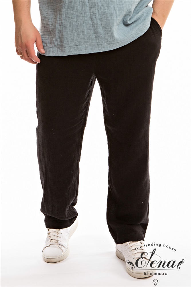 Вид ткани: Муслин Сезон: Летний Силуэт: Свободный Состав: Хлопок 100% Цвет Номенклатуры: черный Мужские брюки из хлопкового полотна - муслина. Брюки свободного, прямого покроя с притачным поясом на резине и шнуре. По бокам размещены карманы. Комментарии к товару