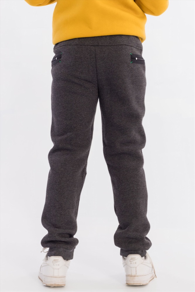 Брюки детские, однотонные (начёс 3-х нитка), с поясом на широкой резинке со шнуром. По бокам в качестве отделки вшита молния (имитация под карман), спереди декоративная нашивка. На коленях отстрочка нитками в цвет полотна, низ брюк на манжетах.