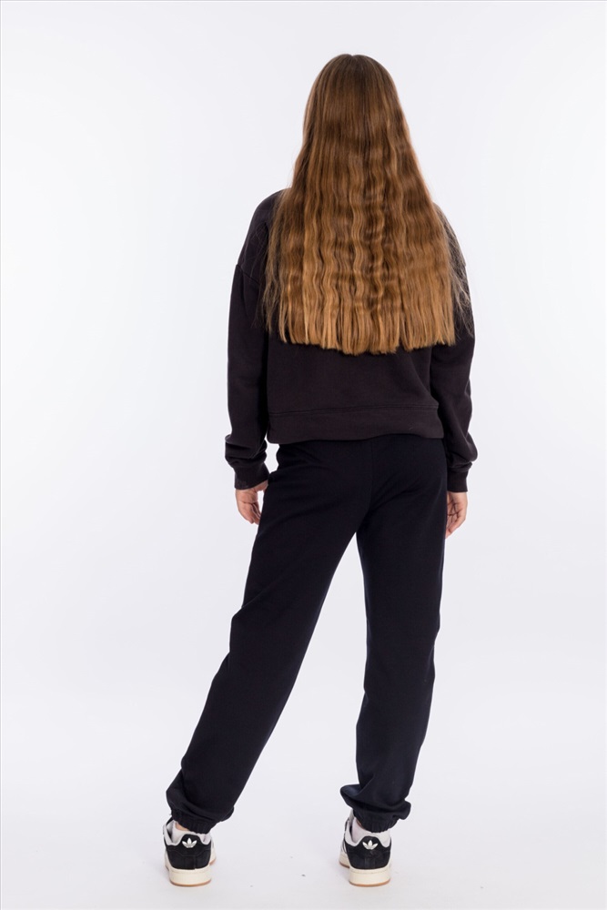 Брюки выполнены из однотонного футера с лайкрой. Пояс и низ брюк на резинке. В поясе через люверсы проложен декоративный шнур, с левой стороны на брюках нанесён термопринт.