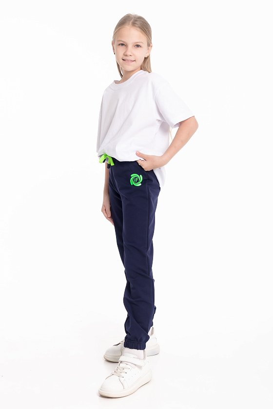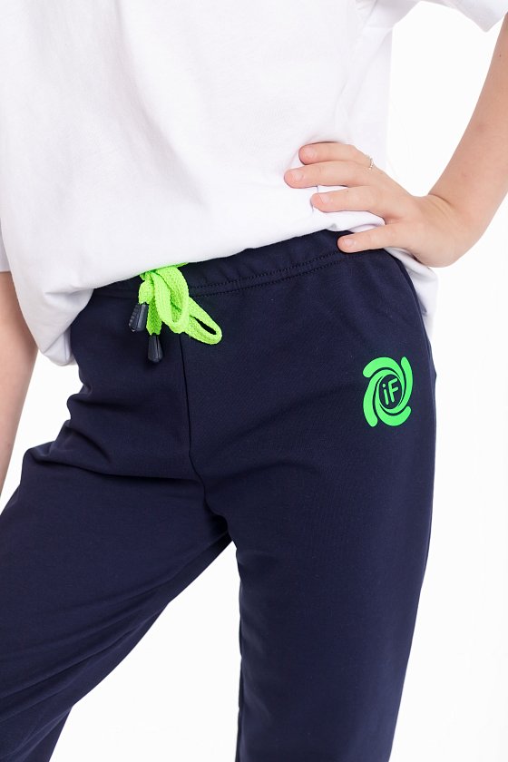 Брюки выполнены из однотонного футера с лайкрой. Пояс и низ брюк на резинке. В поясе через люверсы проложен декоративный шнур, с левой стороны на брюках нанесён термопринт.