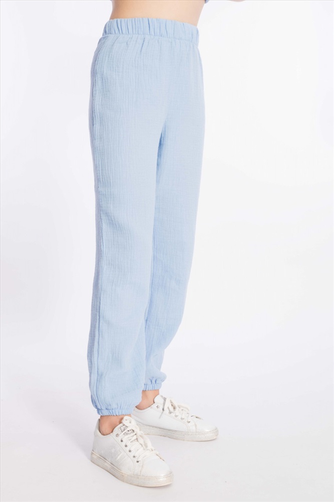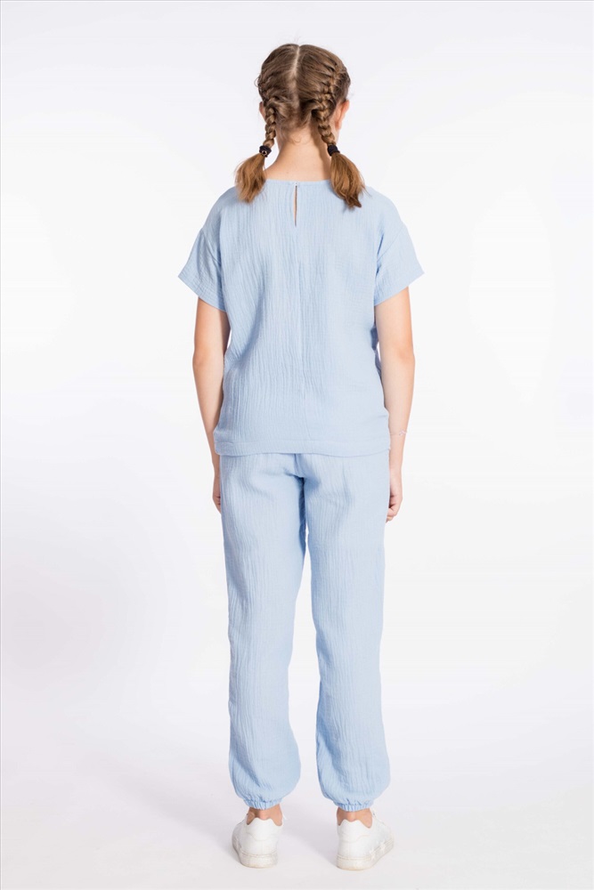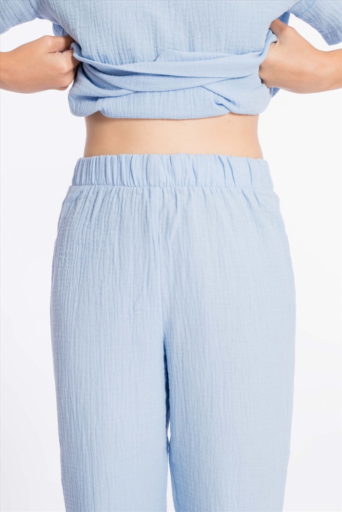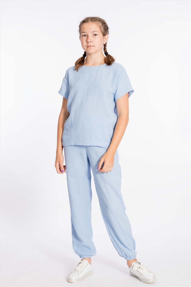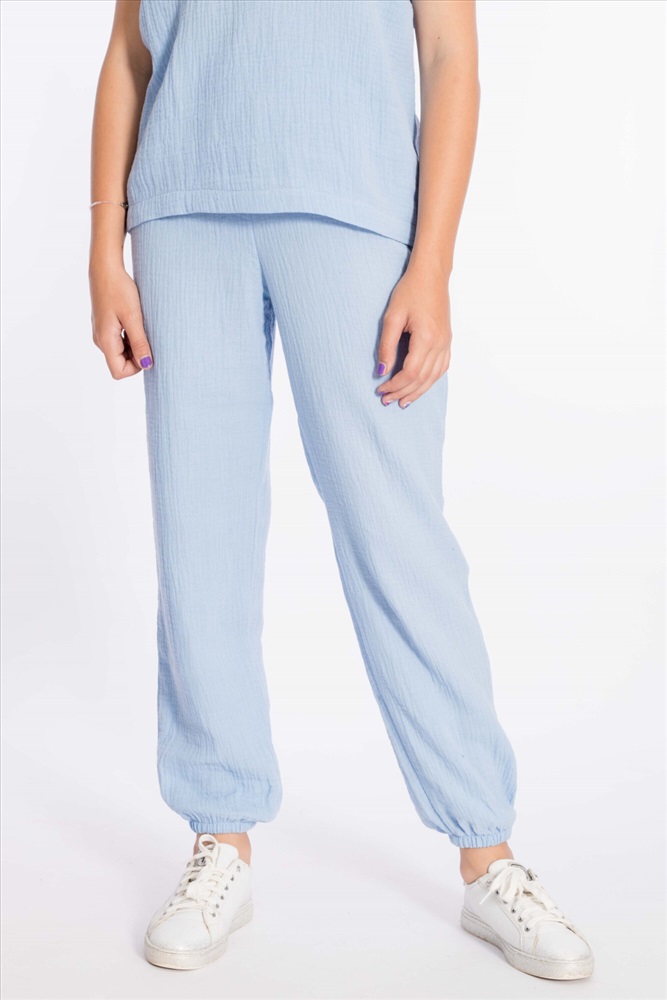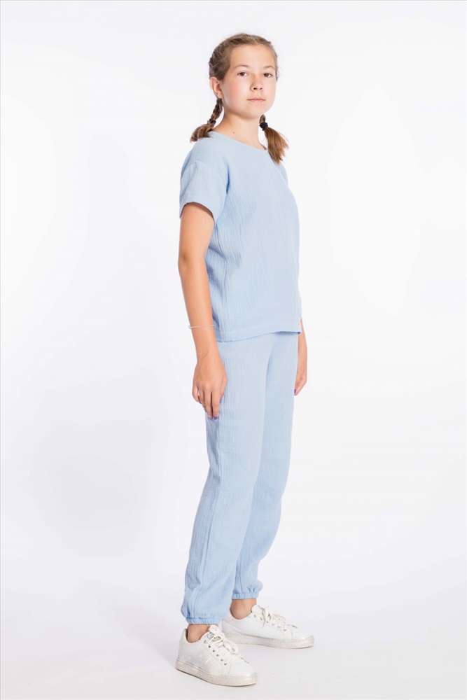 Цвет Номенклатуры: голубой Детские летние брюки выполнены из муслина. Пояс и низ брюк на резинке.