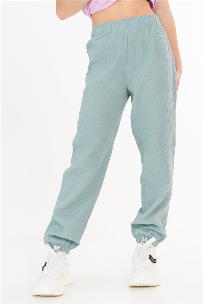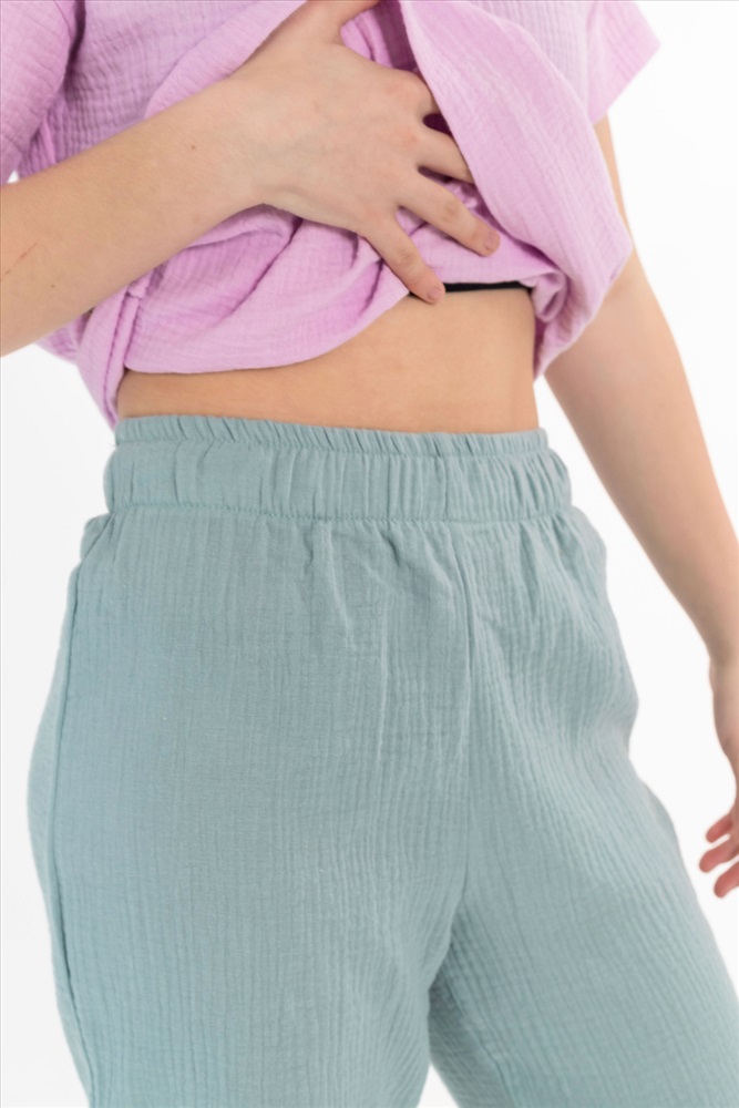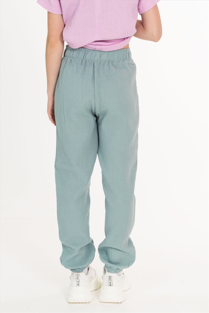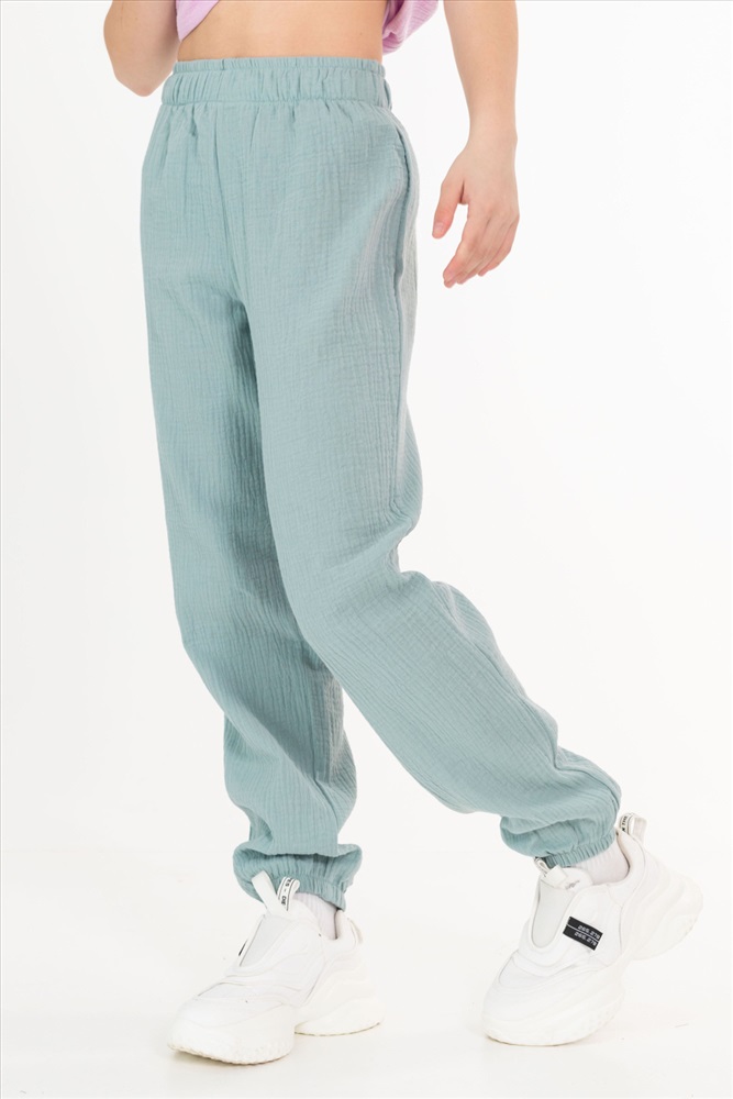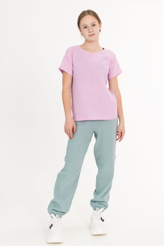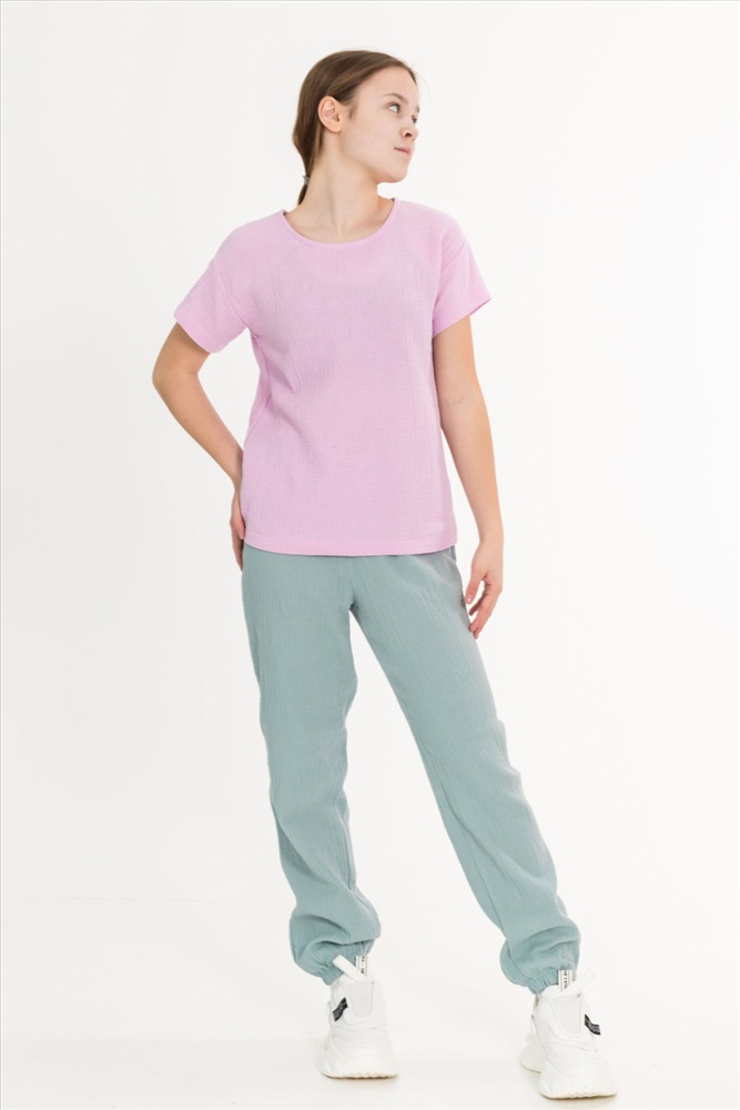 Цвет Номенклатуры: серо-зеленый Детские летние брюки выполнены из муслина. Пояс и низ брюк на резинке.
