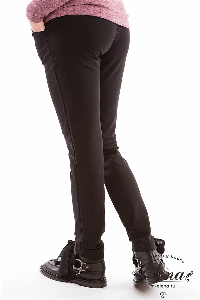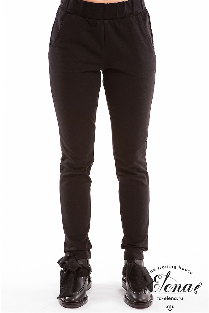 Брюки женские выполнены из однотонной футер петли с лайкрой, с боковыми карманами и притачным поясом на резине.