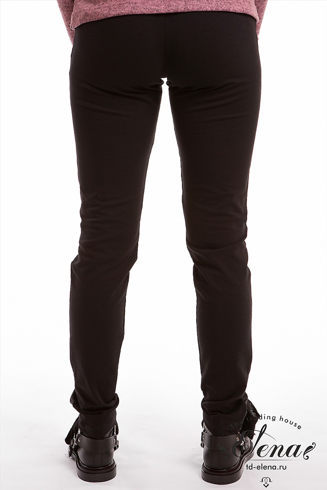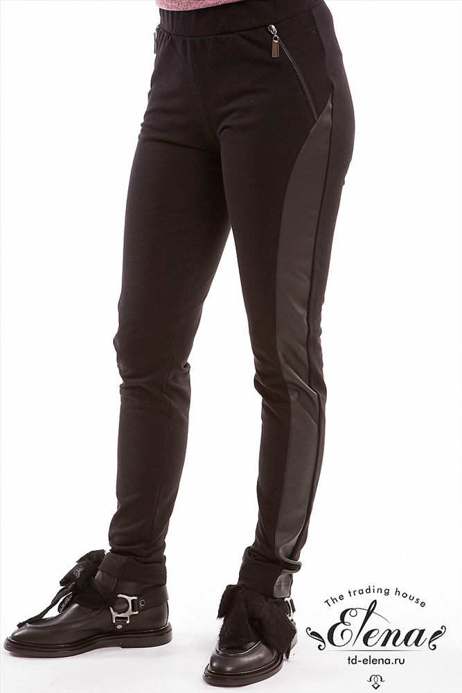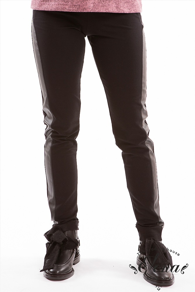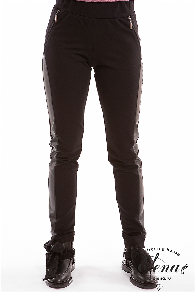 Брюки зауженного силуэта выполнены из футер петли с лайкрой. По бокам отделочные вставки из искусственной кожи и декоративные молнии. Пояс притачной из основного полотна, широкий.