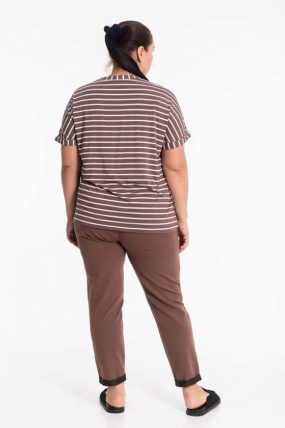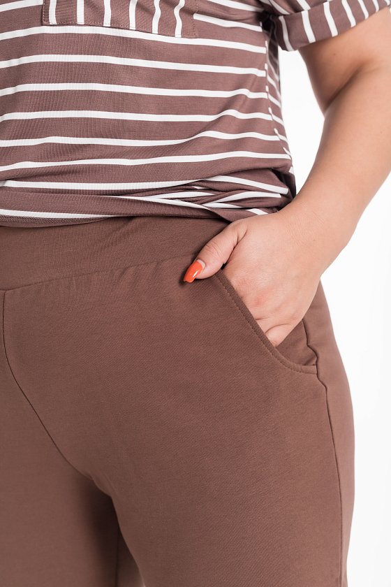 Однотонные коричневые брюки из футера с лайкрой — отличный выбор для повседневной носки. Пояс на резинке обеспечивает удобную посадку, а боковые карманы и отвороты внизу делают модель стильной и практичной. Брюки из футера идеально подойдут для активного отдыха или прогулок.