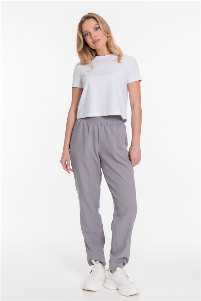 Вид ткани: Лен искусственный Сезон: Летний Силуэт: Свободный Состав: Полиэстер 100% Цвет Номенклатуры: серый Брюки женские из полотна "искусственный лен". Пояс на резинке, боковые карманы, зауженные внизу. Комментарии к товару