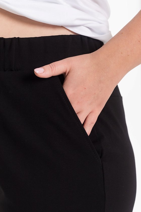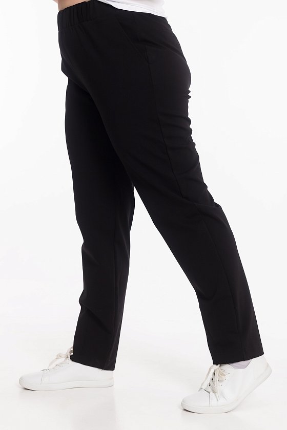 Женские брюки из академика, зауженные к низу. С притачным поясом, шлевками и боковыми карманами. Спереди от низа декоративная вытачка.