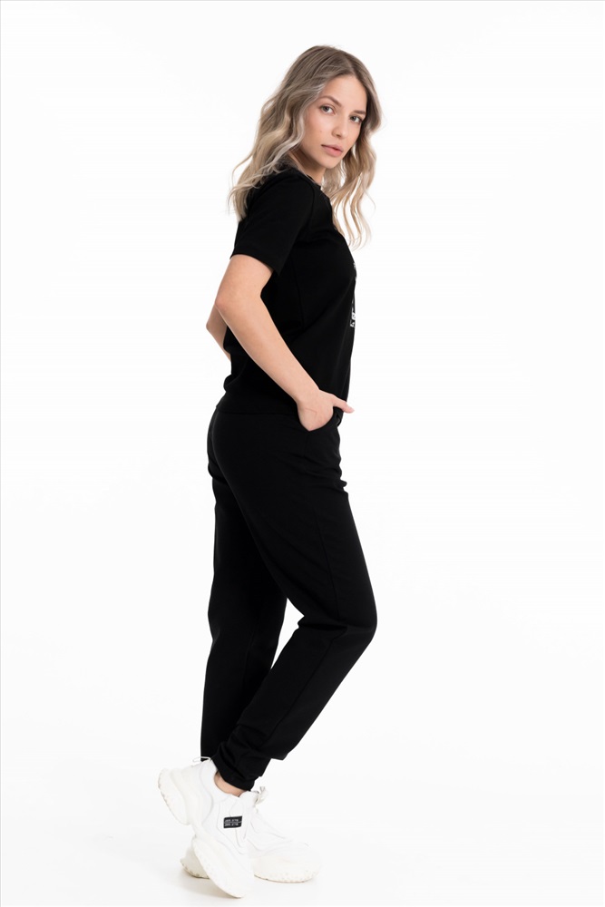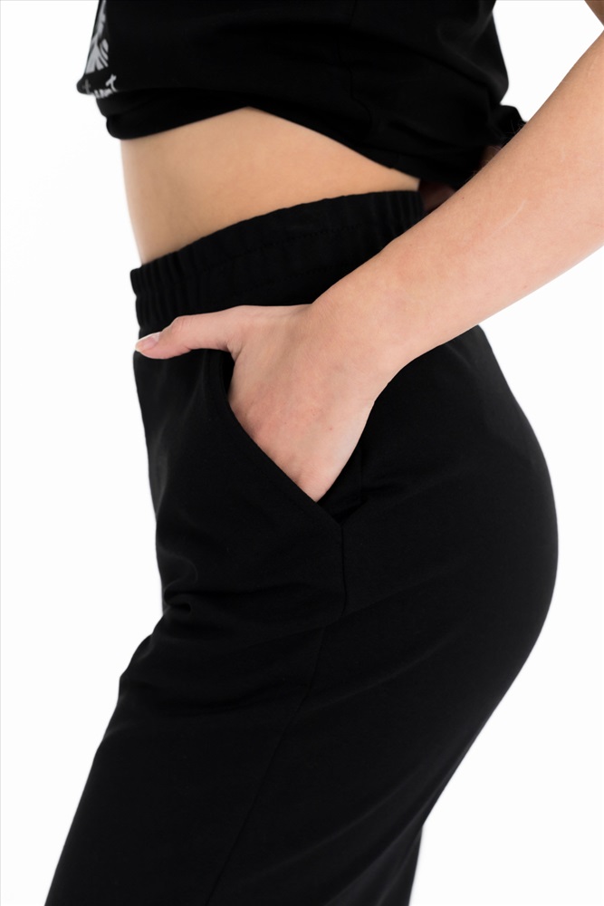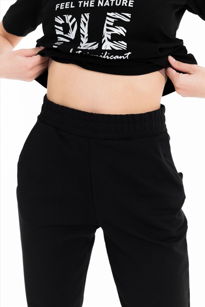 Брюки женские выполнены из футера с лайкрой черного цвета. С боковыми карманами и поясом на резине. Силуэт брюк заужен внизу, сзади и спереди прошиты вытачки как декоративный элемент.