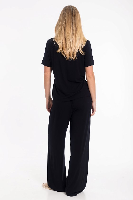 Широкие женские брюки выполнены из чёрной вискозы - гладкого и приятного к телу материала, обеспечивающего комфорт в носке. Модель с поясом на резинке и декоративным шнуром отличается лёгкостью и универсальностью. Брюки без карманов, со средней посадкой, легко комбинируются с различными элементами гардероба.