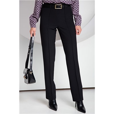 Стильные брюки полуприлегающего силуэта из плотной костюмной ткани. Модель со средней посадкой. Втачной пояс дополнен шлевками под ремень. Переходит в застежку-гульфик на молнию и пуговицу. По переду брючин – застроченные складки, выполняющие функции стрелок. Без карманов.
